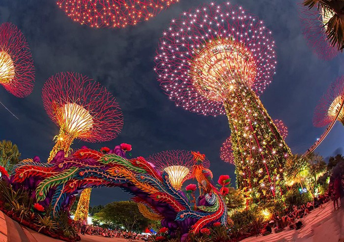 Tại Singapore, Gardens by the Bay trở thành điểm nhấn không thể bỏ qua. Mỗi dịp Trung thu, khu vườn như hóa thành “biển đèn” với các mô hình đèn lồng khổng lồ, triển lãm ánh sáng và các hoạt động văn hóa như biểu diễn nghệ thuật, chợ đêm và workshop làm đèn. Ảnh Avivu