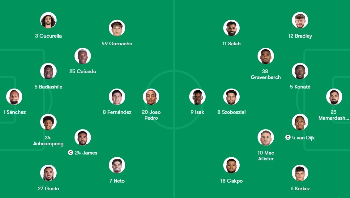 Trên sân nhà, Chelsea nhập cuộc đầy chủ động và chỉ cần 15 phút để xuyên thủng mành lưới đối phương nhờ siêu phẩm sút xa của Moises Caicedo. Trong phần còn lại của hiệp một, Liverpool chơi lúng túng và không có cơ hội nào đáng chú ý, ngoại trừ cú đánh đầu vọt xà của Alexander Isak ở phút 43.