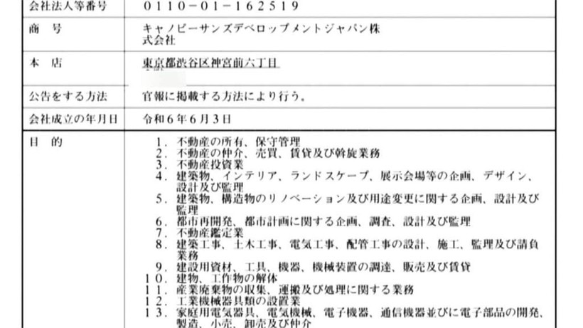 Hồ sơ đăng ký Công ty Canopy Sands Development Japan Co. của Chen Zhi. Ảnh: Kyodo.