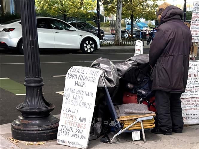 Một người vô gia cư với tấm biển cần giúp đỡ về tài chính trên một tuyến phố ở trung tâm thủ đô Washington D.C.