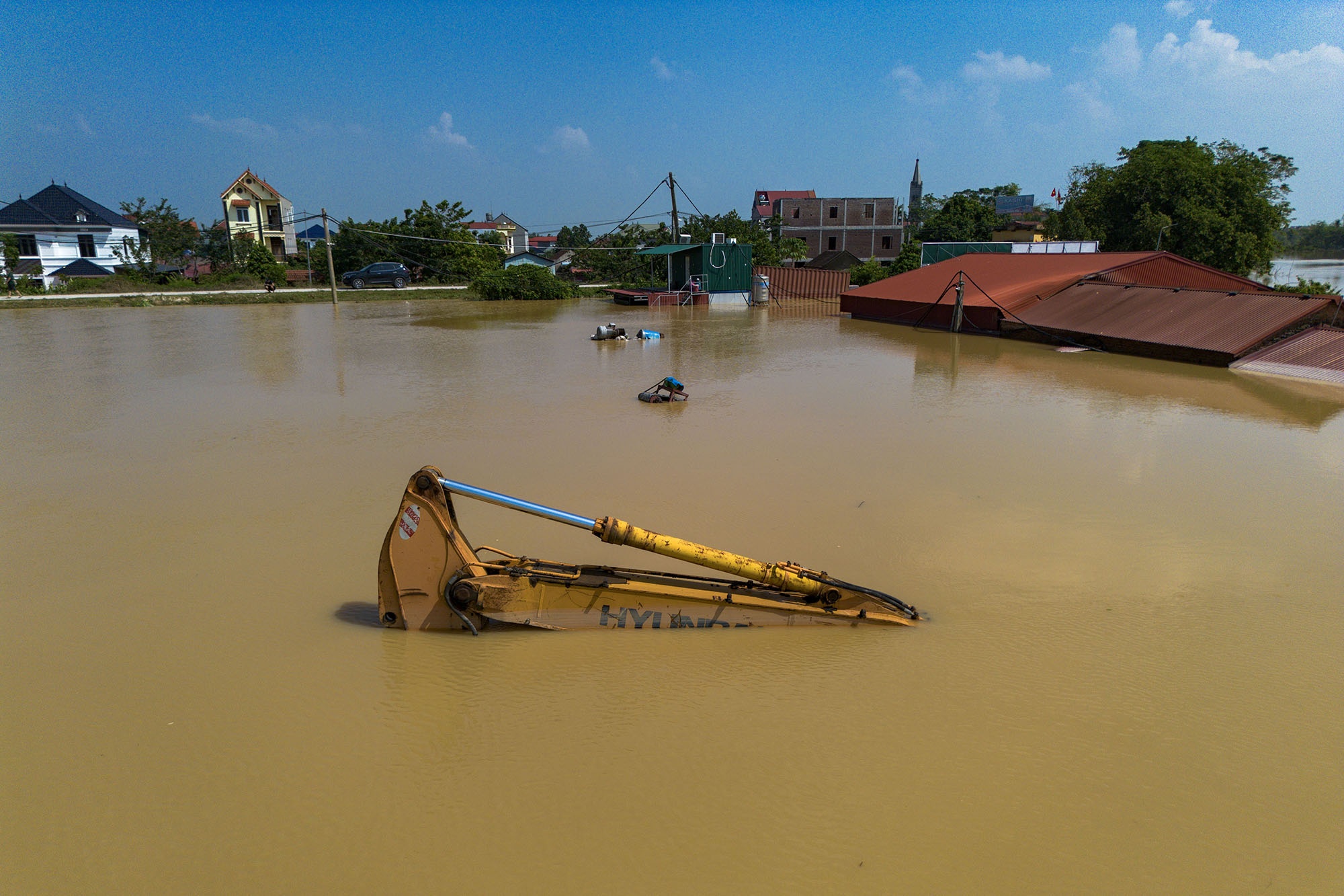 Nước sông nhấn chìm mọi loại máy móc bên ngoài đê gây thiệt hại không hề nhỏ cho các doanh nghiệp đang làm việc tại đây.