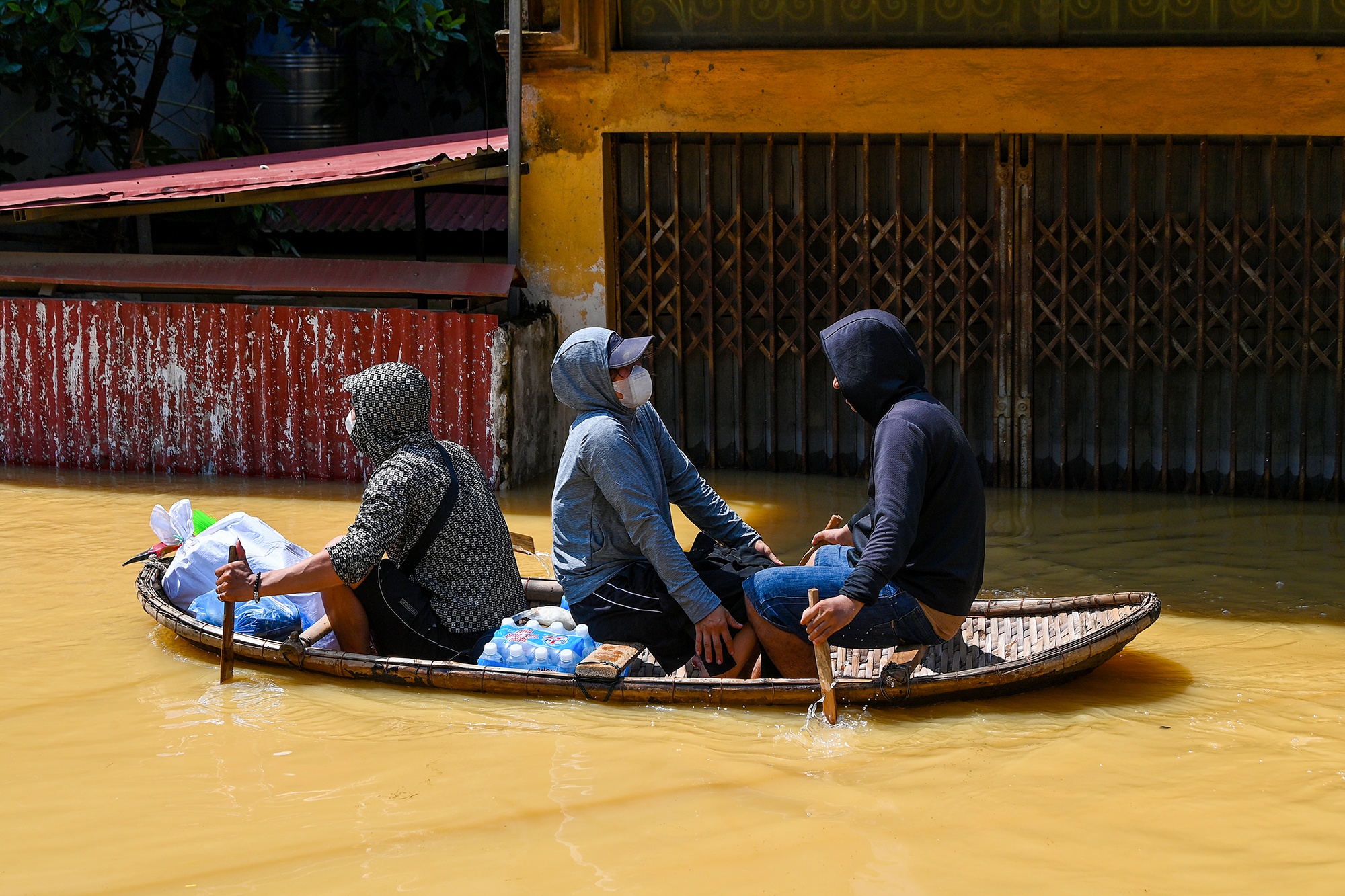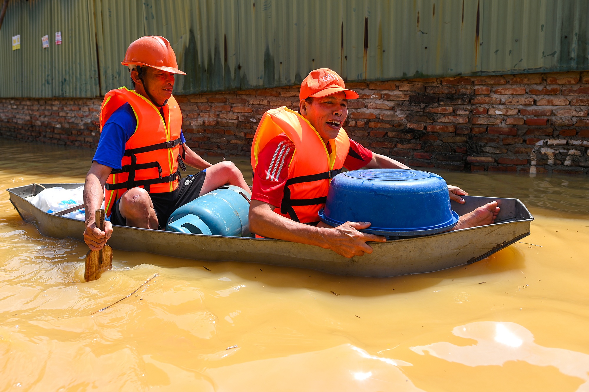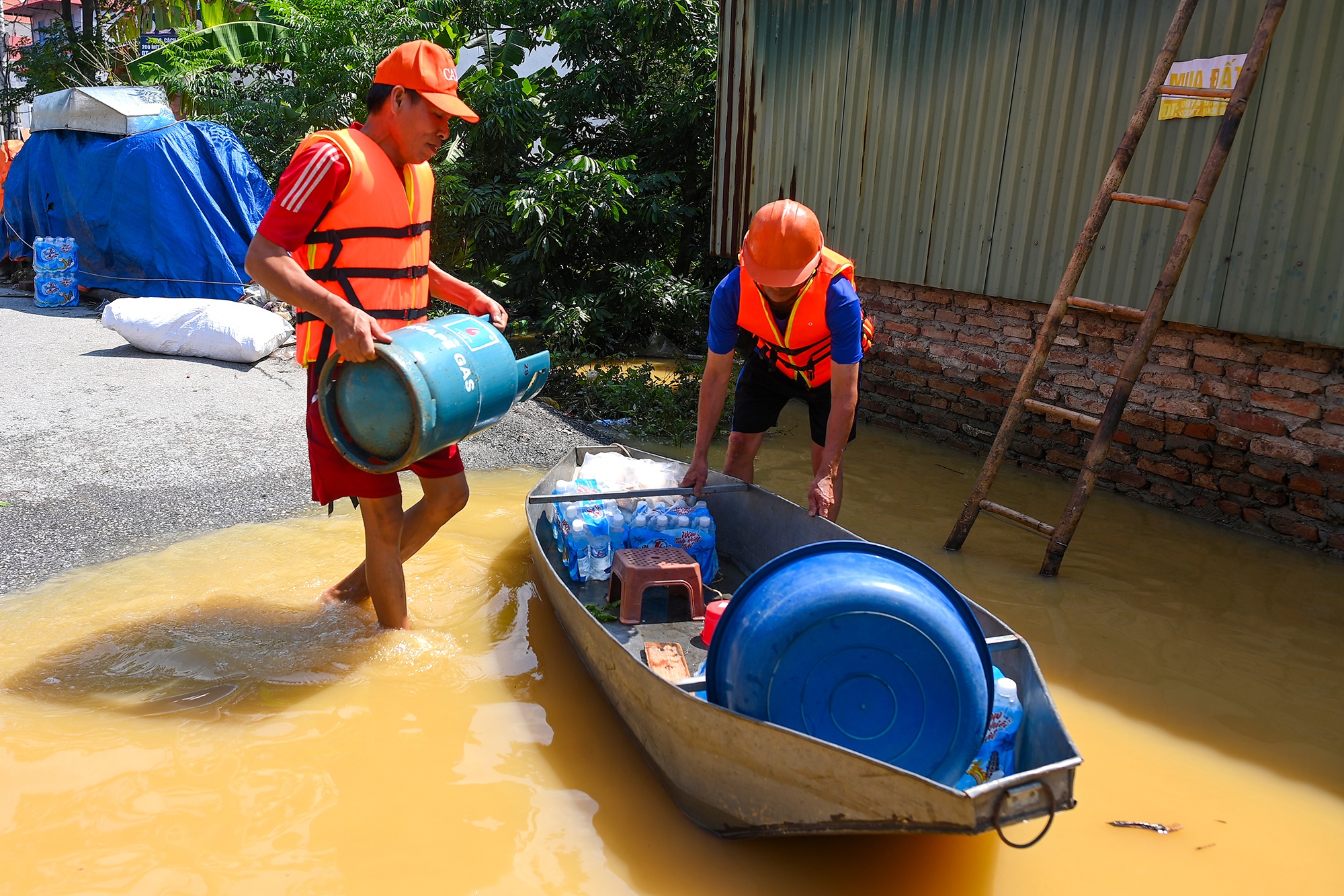 Ông Đỗ Hoàng Hiệp (người chèo thuyền) cùng ông Trần Văn Ngân (người dân làng Mai Trung, Hiệp Hòa) chở nước, đồ ăn và một bình gas vào nhà. Khoảng cách từ mặt đê về nhà khoảng 1 km nhưng nước xiết, nhiều chướng ngại vật bên dưới, khả năng lật thuyền rất cao.