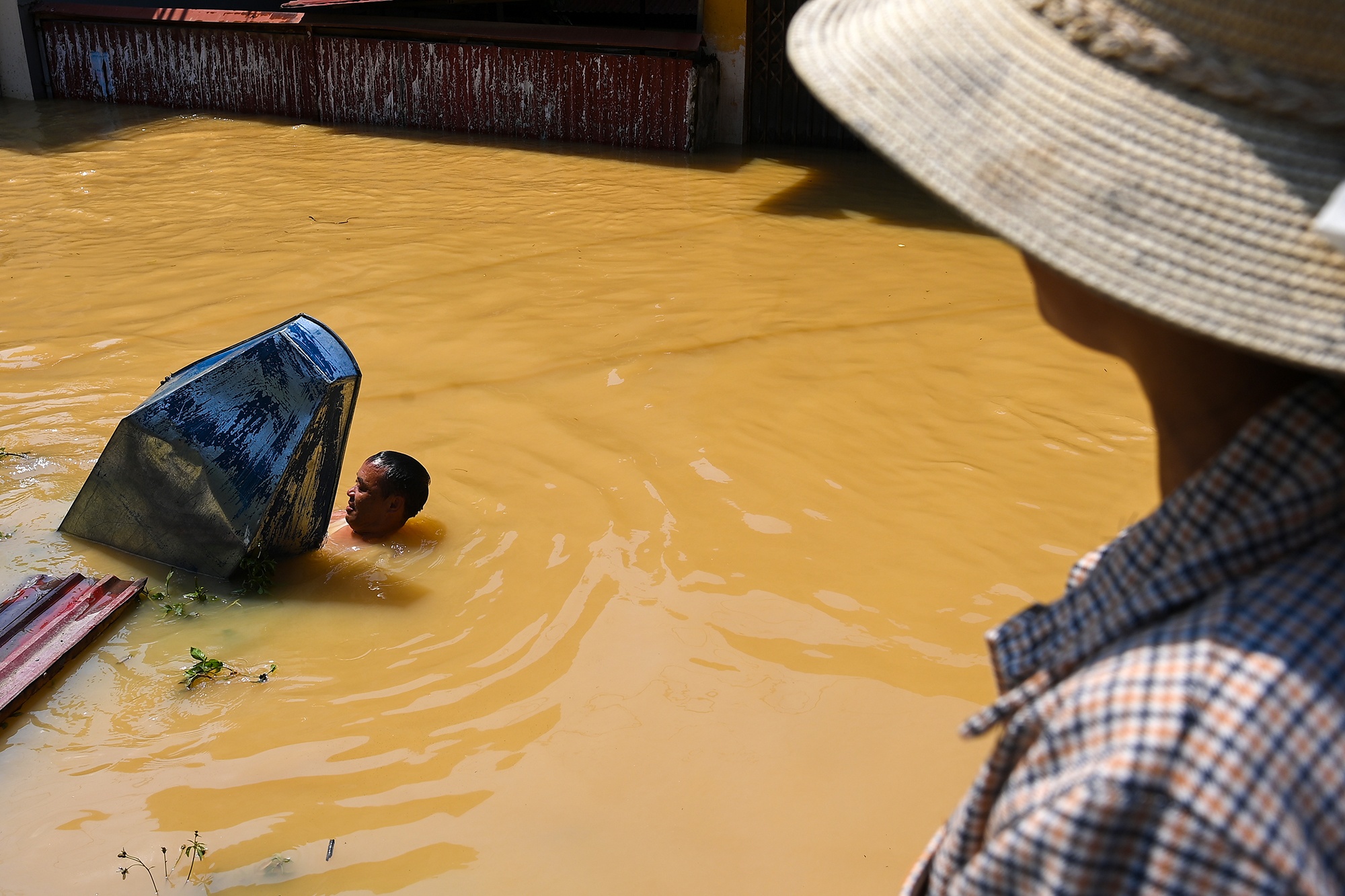 Trên đường đi lấy đồ cứu trợ, chiếc thuyền của ông Tân (người dân làng Mai Trung, Hiệp Hòa) không may bị lật khi đi qua khu vực dòng nước chảy xiết. "Mì tôm, nước uống mới xin được bị trôi hết cả rồi", ông ngán ngẩm nói.