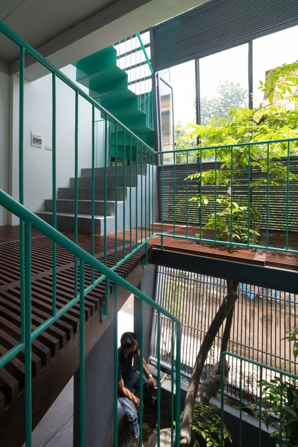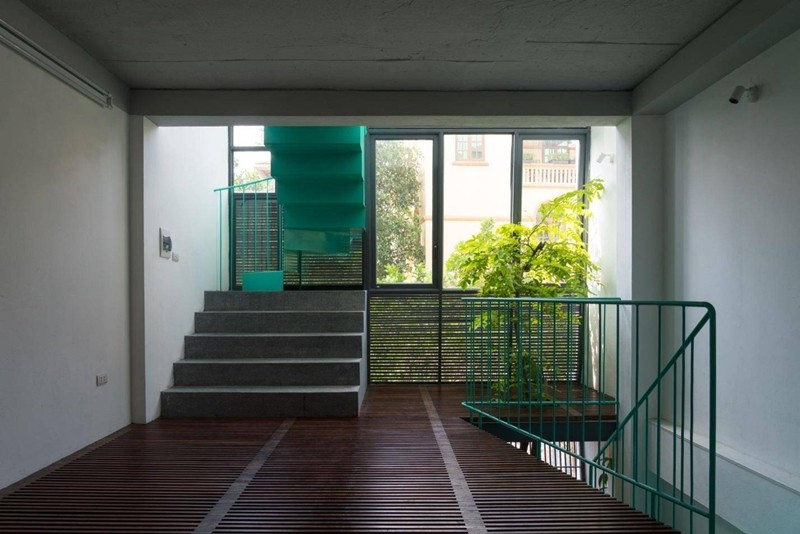 Cầu thang gỗ nối tiếp lên cầu thang láng xi măng và kim loại tạo ấn tượng độc đáo. Ảnh: Triệu Chiến