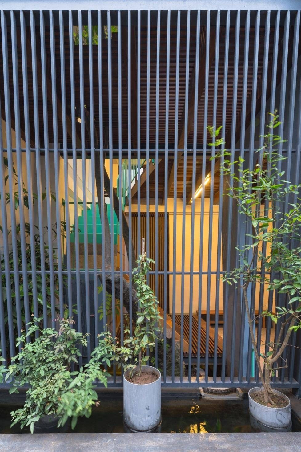 Kirin House có 3 tầng có mặt tiền là khung sắt thoáng đãng và một khu vườn nhỏ. Cánh cổng xoay bằng gỗ to bản. Ảnh: Triệu Chiến