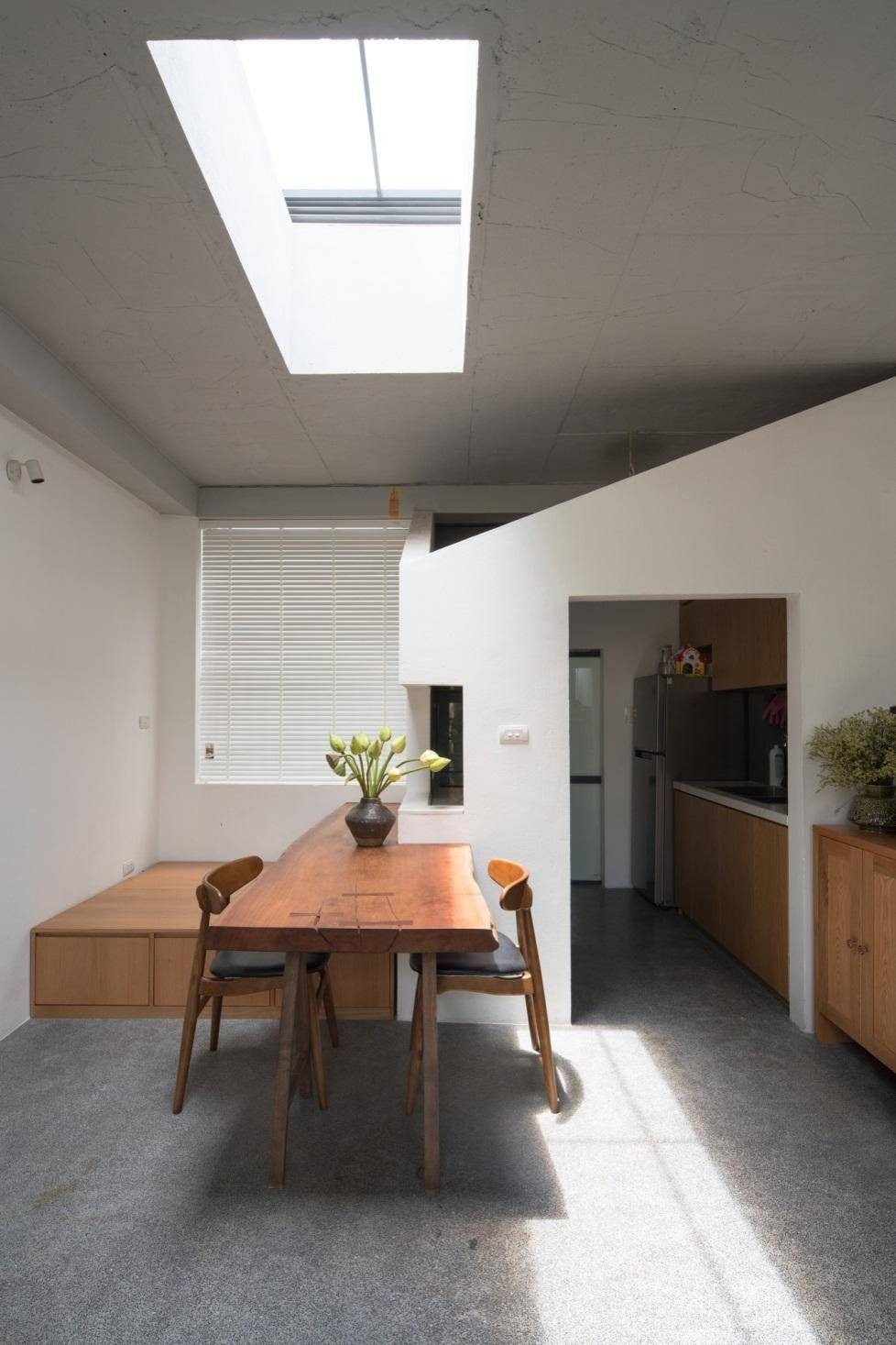 Khu phòng ăn với sàn xi măng, bàn gỗ đơn giản và bên cạnh là bếp ở tầng 3. Ảnh: Triệu Chiến