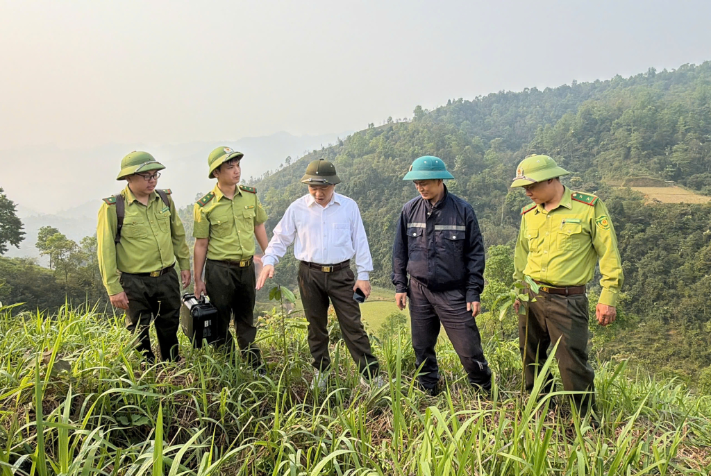 Đoàn công tác kiểm tra trực tiếp diện tích trồng rừng thay thế tại xóm Tổng Ngà, xã Nguyên Bình.