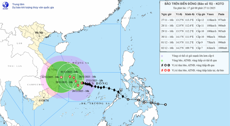 Thông báo nêu, về tình hình thiên tai: Đêm 25 tháng 11 năm 2025, bão KOTO đã đi vào Biển Đông (bão số 15), cường độ cấp 8, giật cấp 10. Dự báo bão có thời gian lưu gió trên biển lâu (5-6 ngày), cường độ gió mạnh trên biển cấp 8-9, giật cấp 11 (có thể lên cấp 10-11, giật cấp 14 ở Bắc Trường Sa); có khả năng gây mưa lớn trở lại cho các tỉnh Gia Lai, Đắk Lắk, Khánh Hòa, Lâm Đồng. Trong bối cảnh các địa phương này đang chịu hậu quả nặng nề của đợt lũ lịch sử, nguy cơ "lũ chồng lũ, bão chồng lũ" là rất hiện hữu, đòi hỏi sự sẵn sàng cao độ để ứng phó thiên tai "kép".