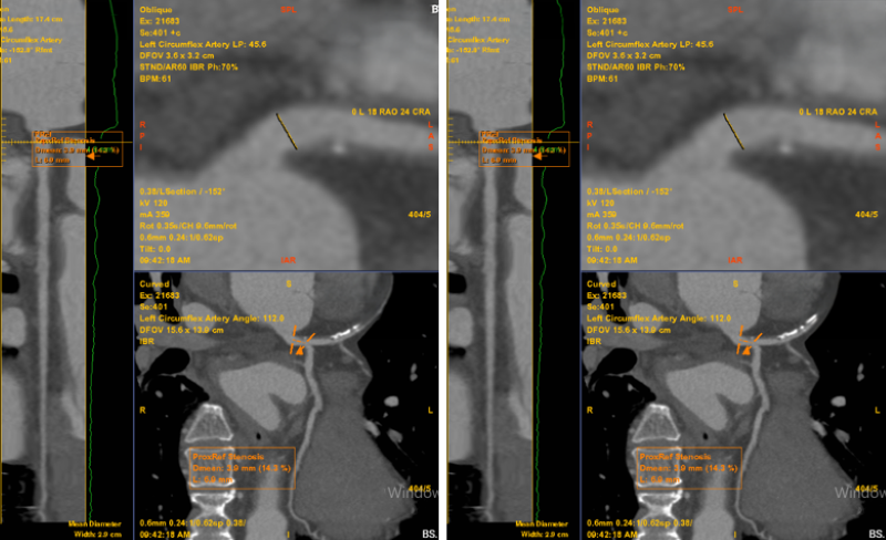 Nhận định cơn đau ngực có nhiều khả năng liên quan đến bệnh lý mạch vành, các bác sĩ đã chỉ định chụp MSCT mạch vành. Kết quả cho thấy bệnh nhân có mảng xơ vữa hỗn hợp gây hẹp khoảng 60–70% đoạn LAD1–2, được phân loại CAD-RADS 3.