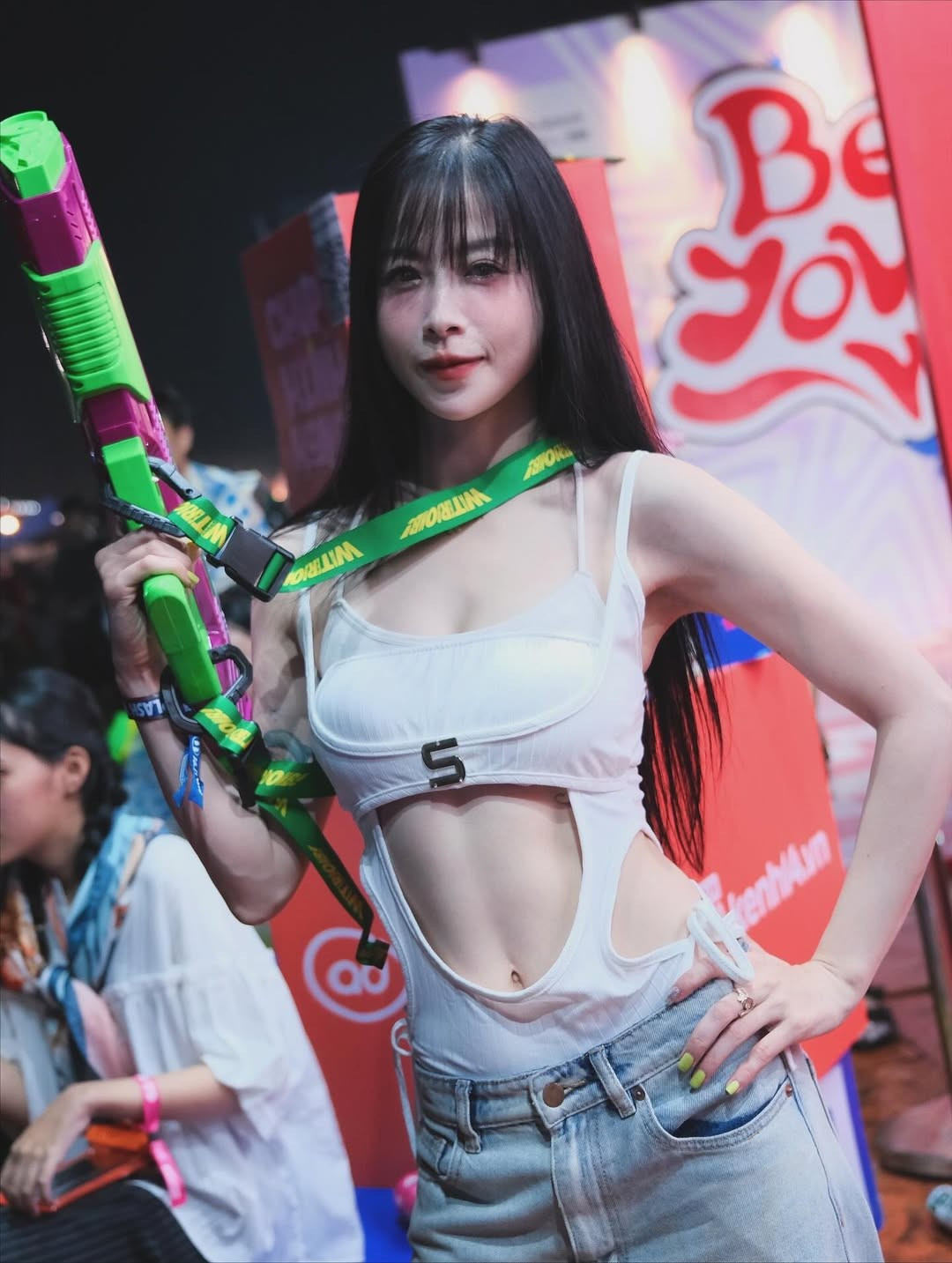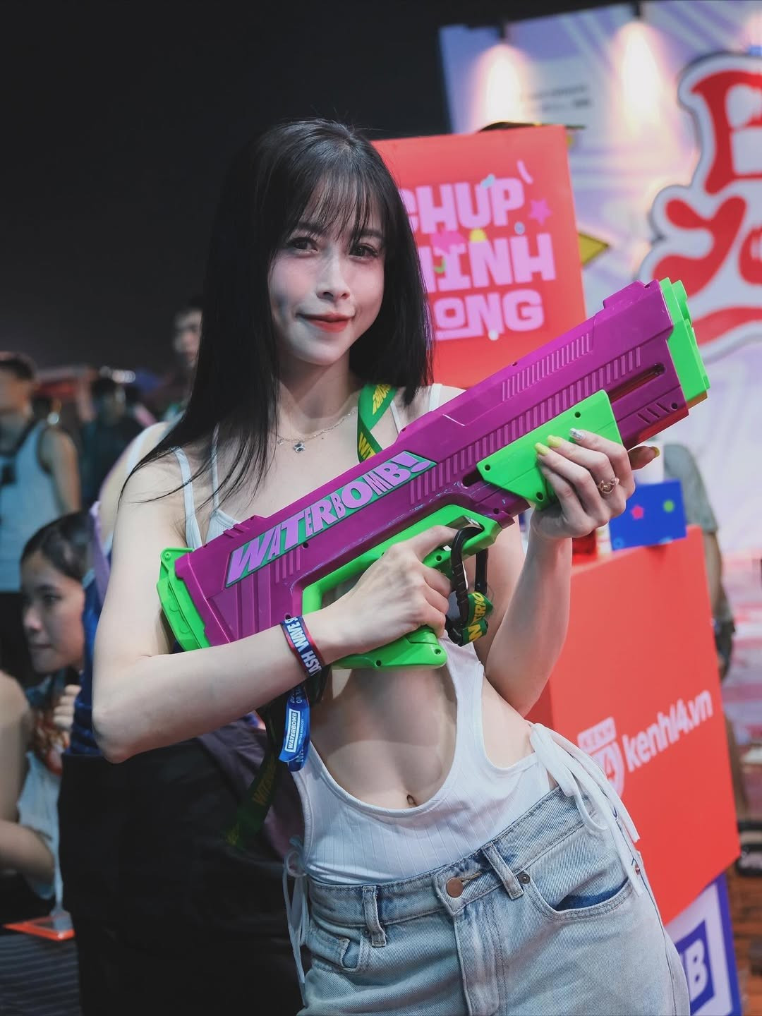 Không thể thiếu "vũ khí" Waterbomb đặc trưng là khẩu súng nước màu hồng tím neon và xanh lá nổi bật. Nữ vận động viên liên tục tạo dáng chuyên nghiệp, toát lên thần thái rạng rỡ, cuốn hút giữa đám đông. (Ảnh: IGNV)