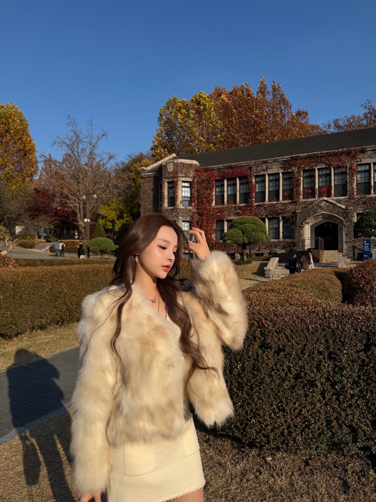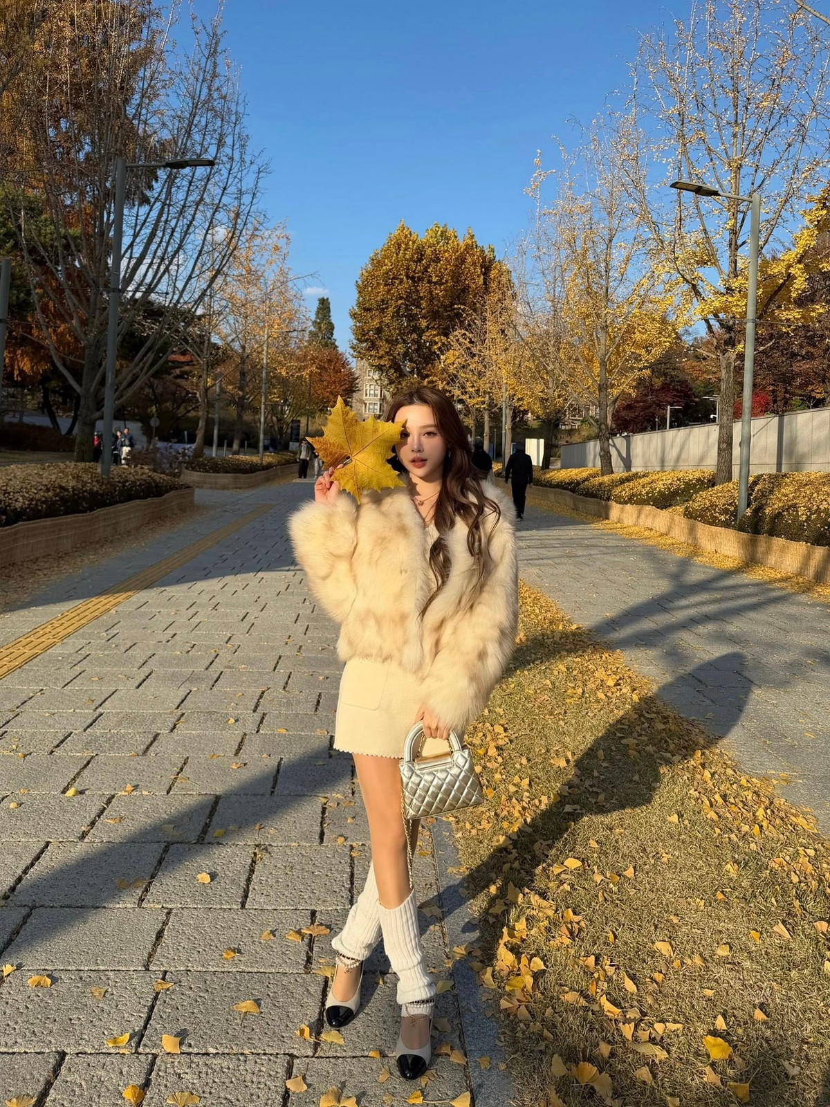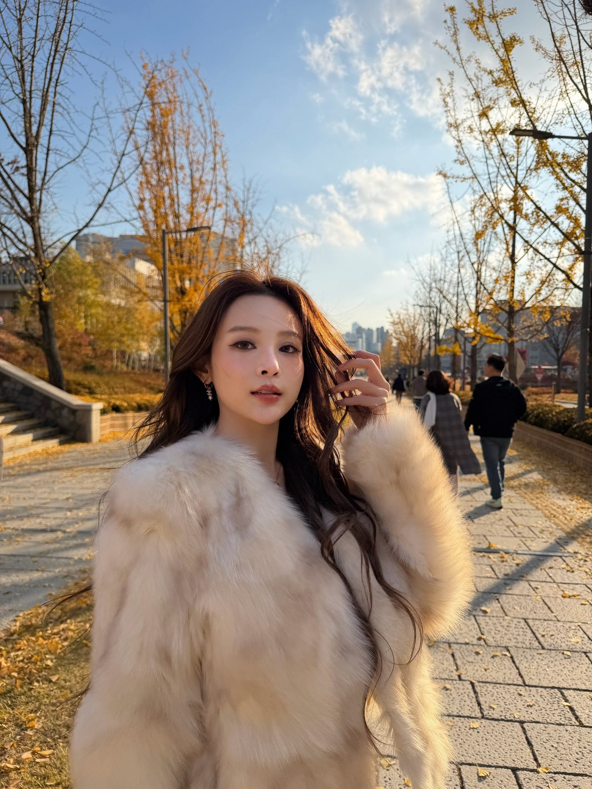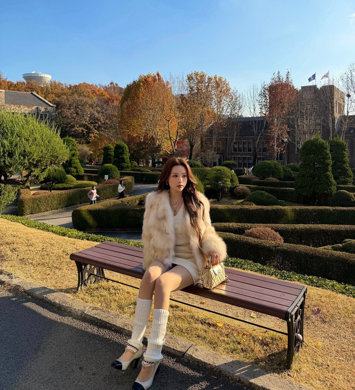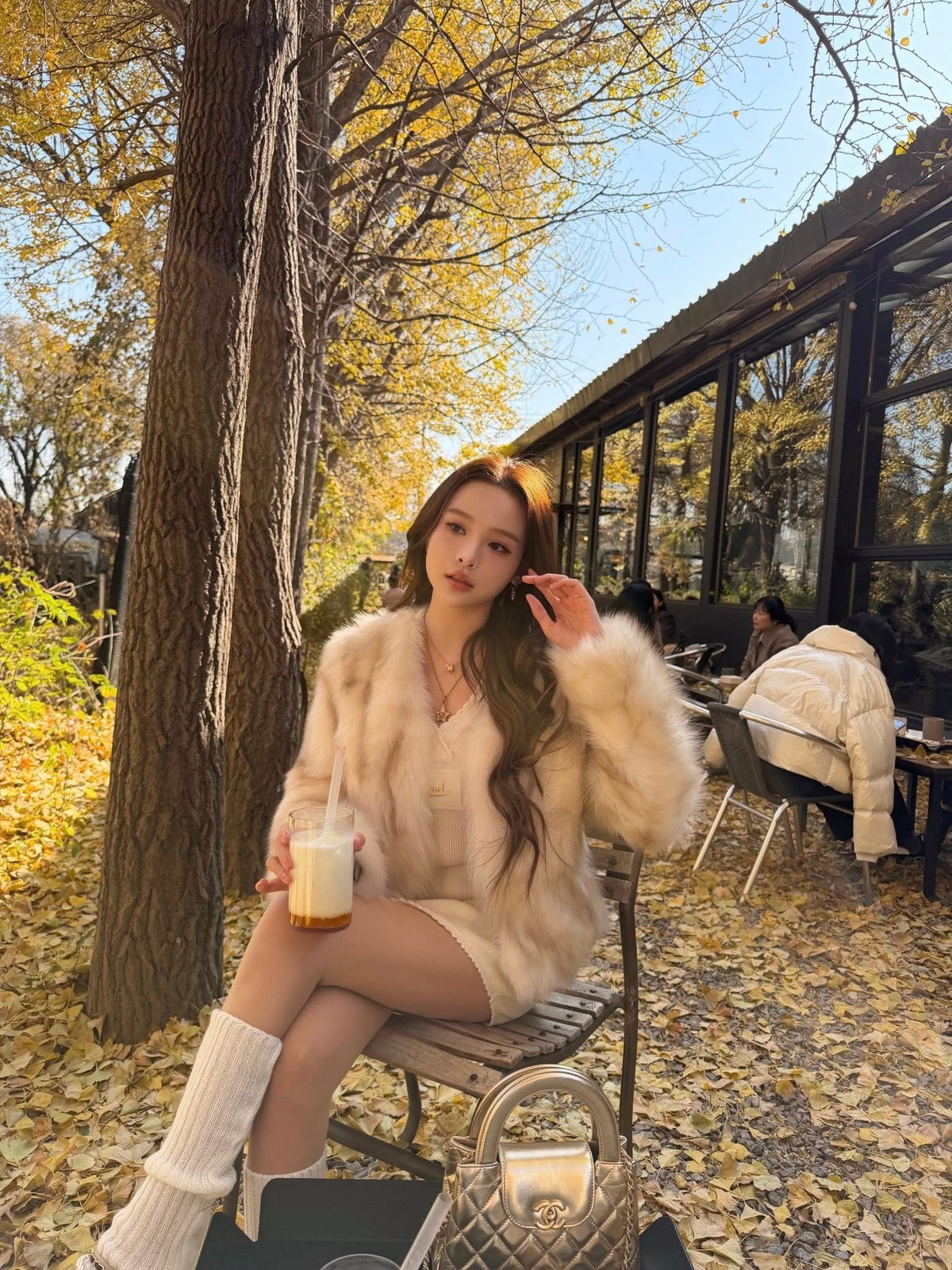 Chiếc áo khoác lông ngắn (faux fur) màu loang nhẹ vừa giữ ấm, vừa tạo nên vẻ ngoài quyền quý, sang trọng.
