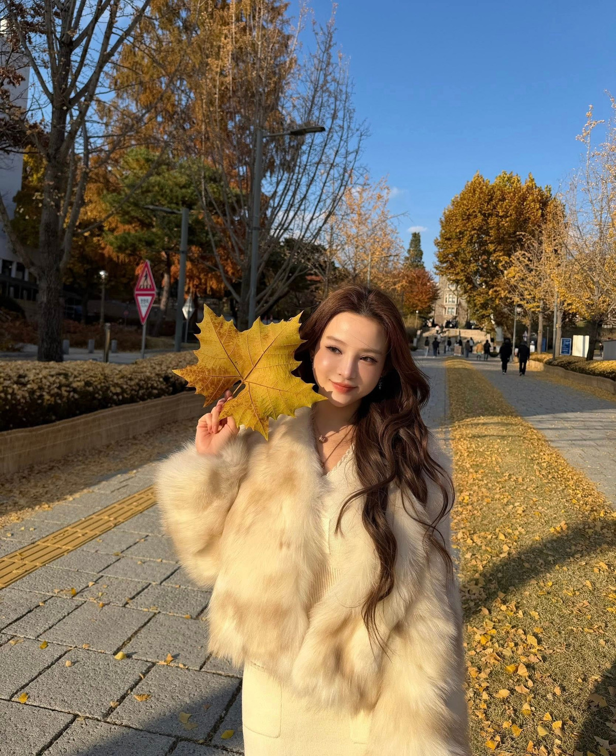 Không chỉ gây ấn tượng bởi nhan sắc, outfit của Huyền Baby trong chuyến đi này cũng là điểm cộng lớn, thể hiện gu thẩm mỹ tinh tế. Cô chọn set đồ với tông màu chủ đạo là kem (cream) và be (beige), cực kỳ "bắt" với bối cảnh lá vàng xung quanh.