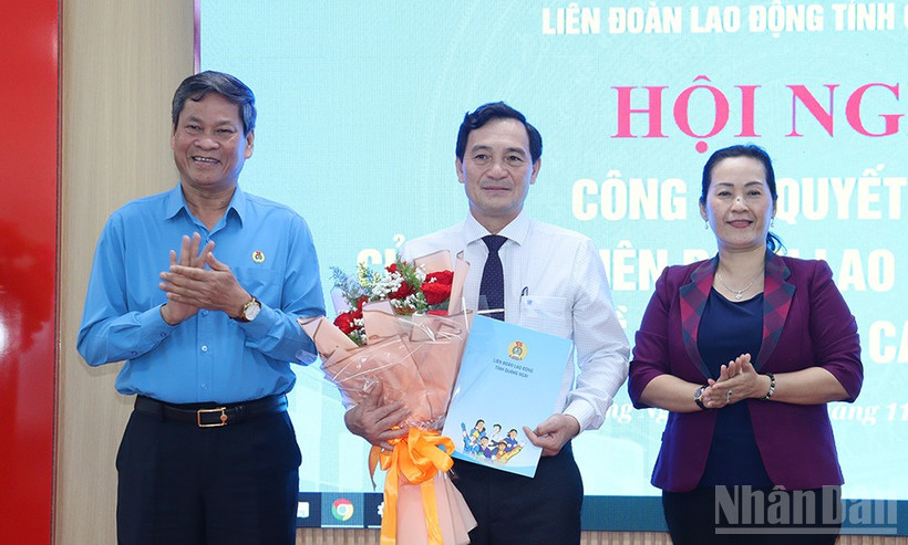 Lãnh đạo Tổng Liên đoàn Lao động Việt Nam và Tỉnh ủy Quảng Ngãi trao Quyết định và tặng hoa chúc mừng đồng chí Đinh Quốc Tuấn.