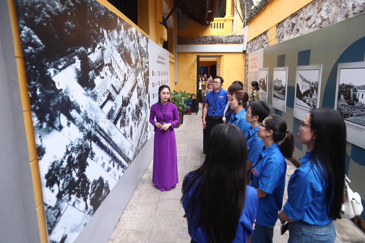 Các đoàn viên lắng nghe thuyết minh về quá trình hình thành và hoạt động của Nhà tù Hỏa Lò. Ảnh: Lê Khánh.