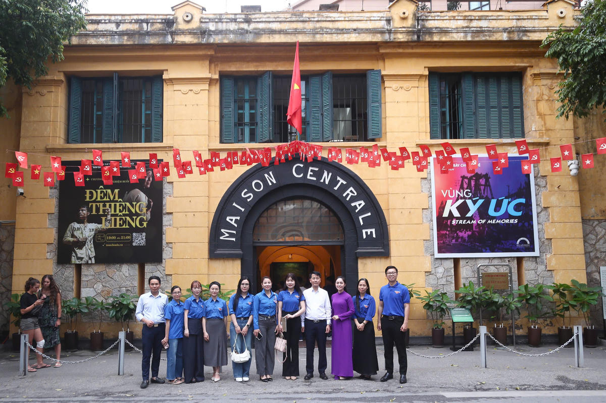 Đoàn viên Chi đoàn Báo Đại đoàn kết chụp hình lưu niệm cùng đại diện Ban Quản lý di tích nhà tù Hỏa Lò. Ảnh: Lê Khánh.