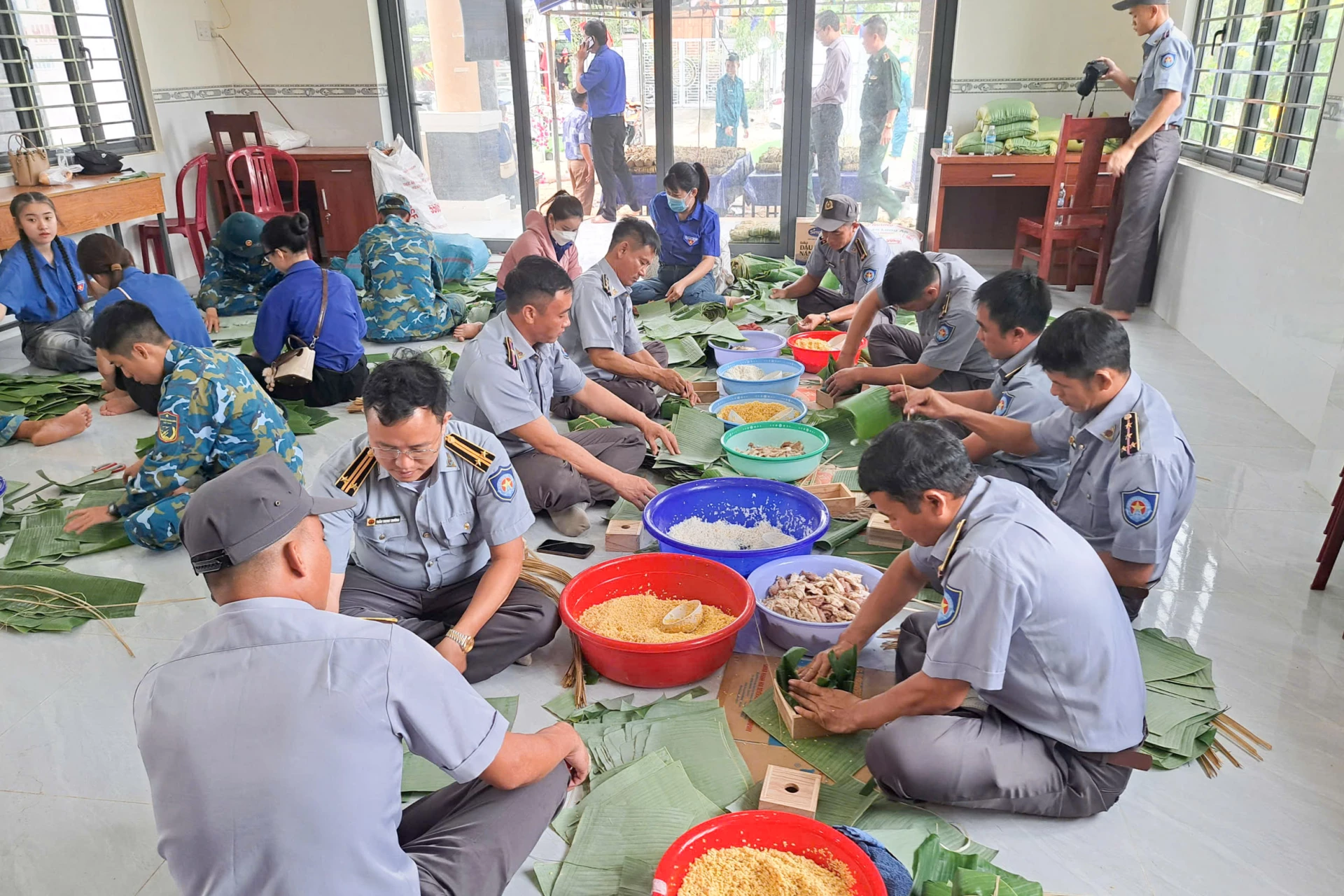 Cán bộ, nhân viên chi đội tham gia hoạt động gói bánh chưng, bánh tét hỗ trợ các đối tượng chính sách phường Ba Ngòi.