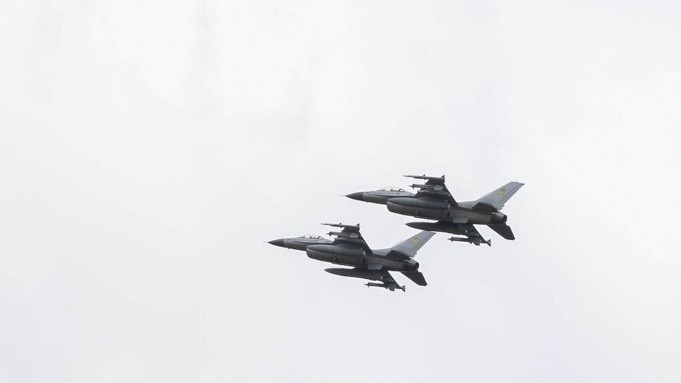 Hai tiêm kích F-16 Fighting Falcon trong một cuộc trình diễn trên không ở Ukraine, ngày 4/8/2024. Ảnh: Ukrainian Presidency