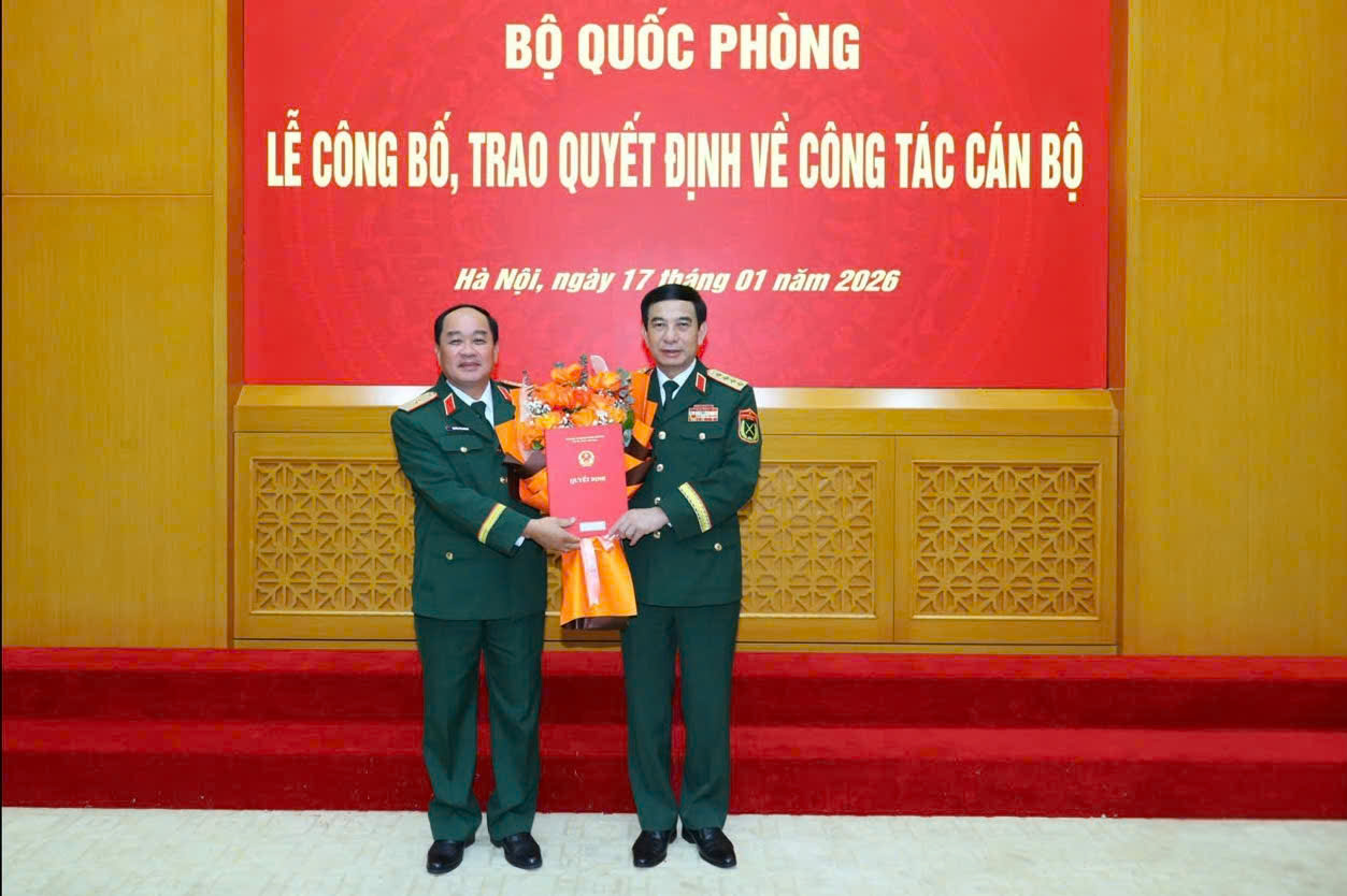Đại tướng Phan Văn Giang, Ủy viên Bộ Chính trị, Bộ trưởng Bộ Quốc phòng, trao quyết định cho Thiếu tướng Nguyễn Văn Ngành