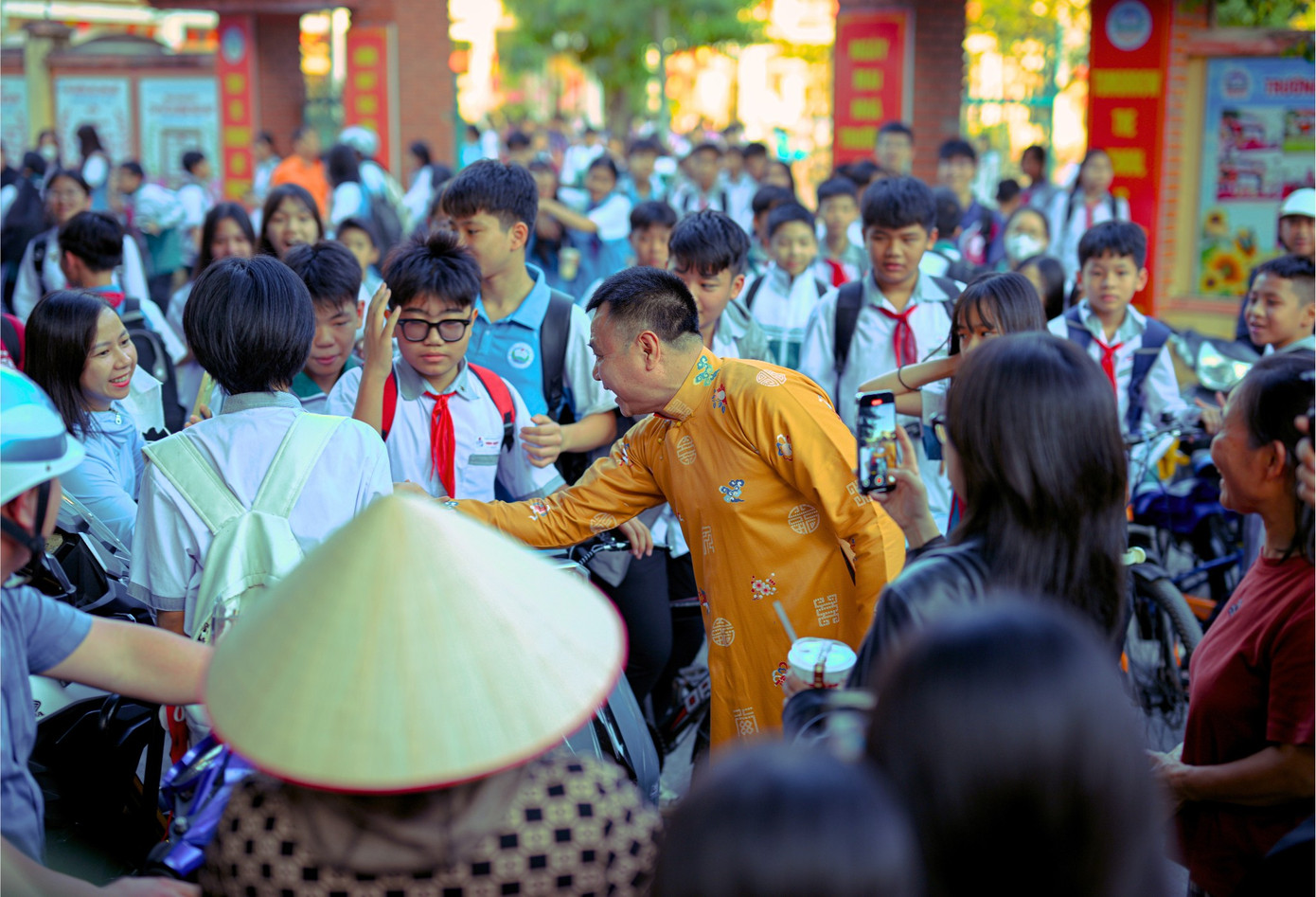 NSND Tự Long được bà con và khán giả nhí vây quanh.