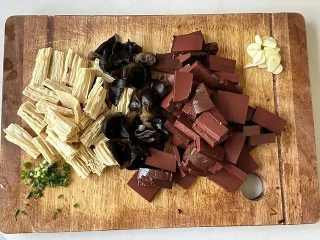 Ngâm mềm tàu hũ ky rồi cắt khúc, mộc nhĩ ngâm trước 30 phút, rửa sạch, tiết heo cắt miếng nhỏ, tỏi thái lát.