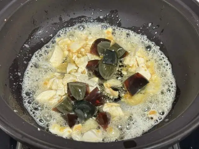 Cho một ít dầu vào nồi, phi trứng vịt muối đến khi mịn. Sau đó cho trứng bắc thảo đã cắt miếng vào, đảo đều vài lượt.