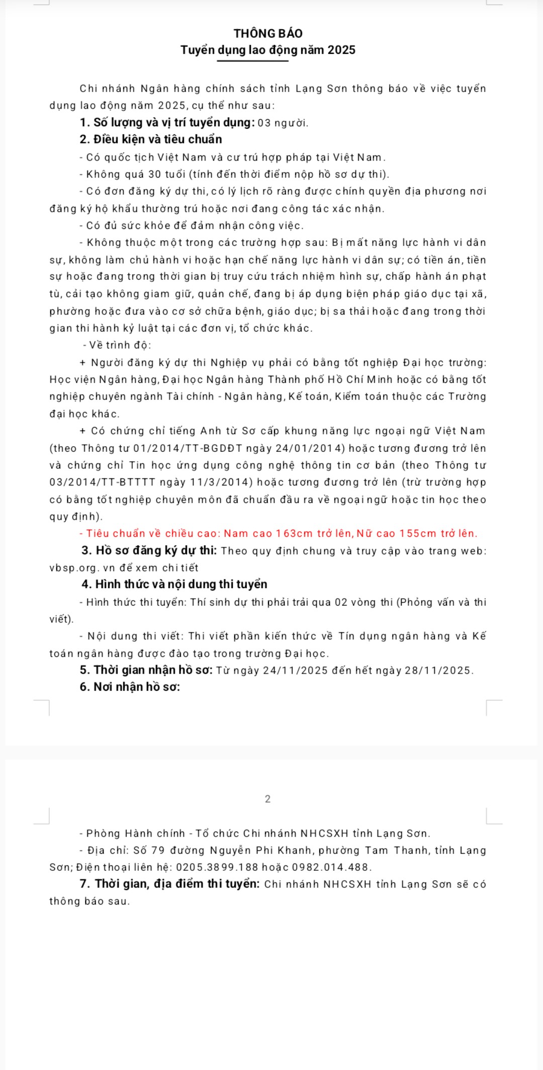 Chi nhánh ngân hàng Chính sách tỉnh Lạng Sơn thông báo tuyển dụng lao động năm 2025