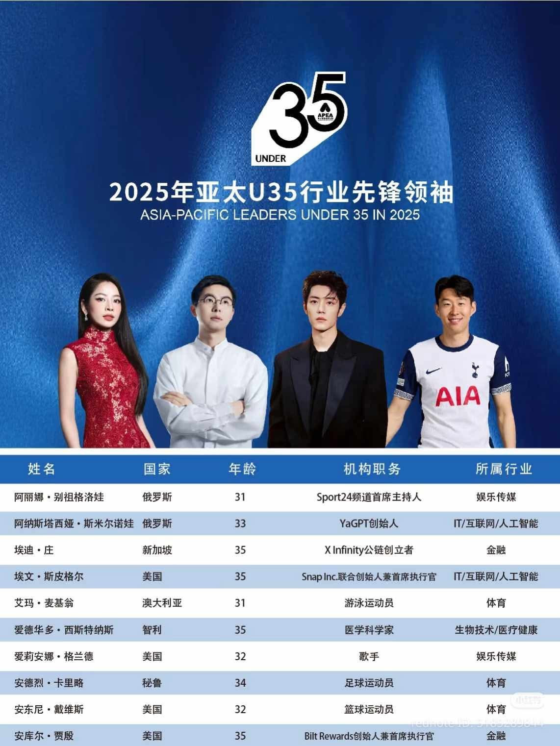 Mới đây, APEA (Diễn đàn Doanh nhân Châu Á - Thái Bình Dương) nằm trong khuôn khổ Hội nghị Thượng đỉnh APEC 2025 đã công bố bảng xếp hạng Những nhà lãnh đạo tiên phong dưới 35 tuổi (U35) khu vực châu Á - Thái Bình Dương năm 2025. Nhiều nhân vật trong lĩnh vực văn hóa, nghệ thuật và thể thao của Trung Quốc có tên trong danh sách như: , , Đàn Kiện Thứ, Lý Hiện...