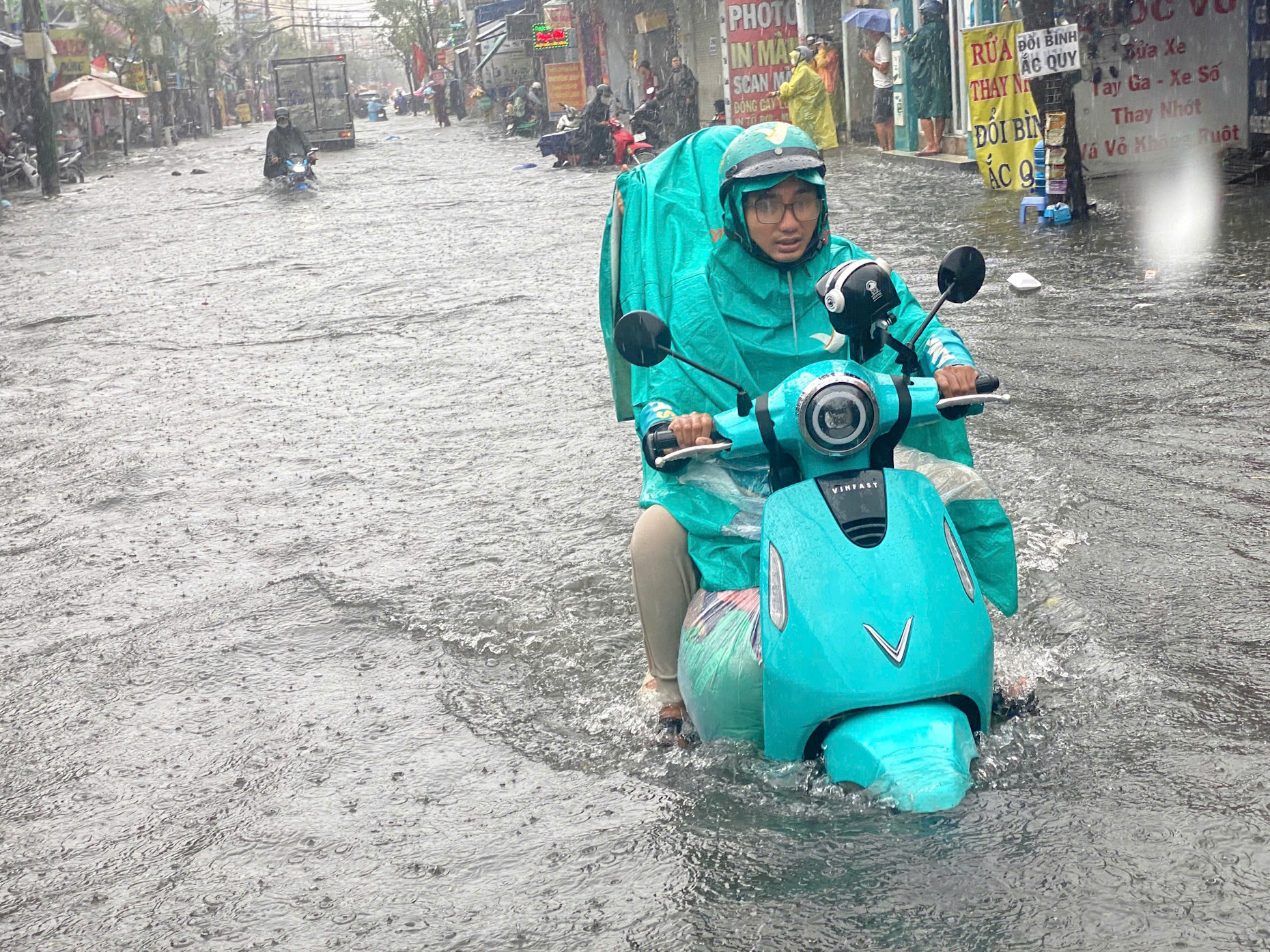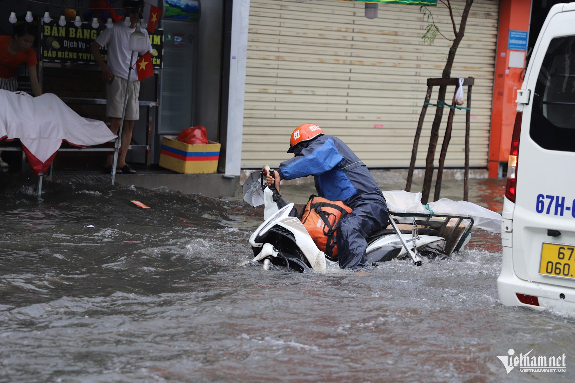 Đến gần 15h, đường vẫn ngập sâu khiến xe chết máy hàng loạt. Người dân phải xuống xe dắt bộ "bơi" trong dòng nước. Nhiều người mệt mỏi, bất lực tìm chỗ trú hoặc tìm kiếm dịch vụ sửa xe.