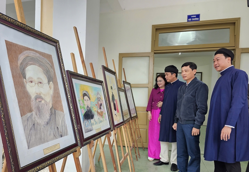 Tham quan các tác phẩm ký họa về cụ Phan Bội Châu do học sinh Trường THCS Phan Sào Nam vẽ