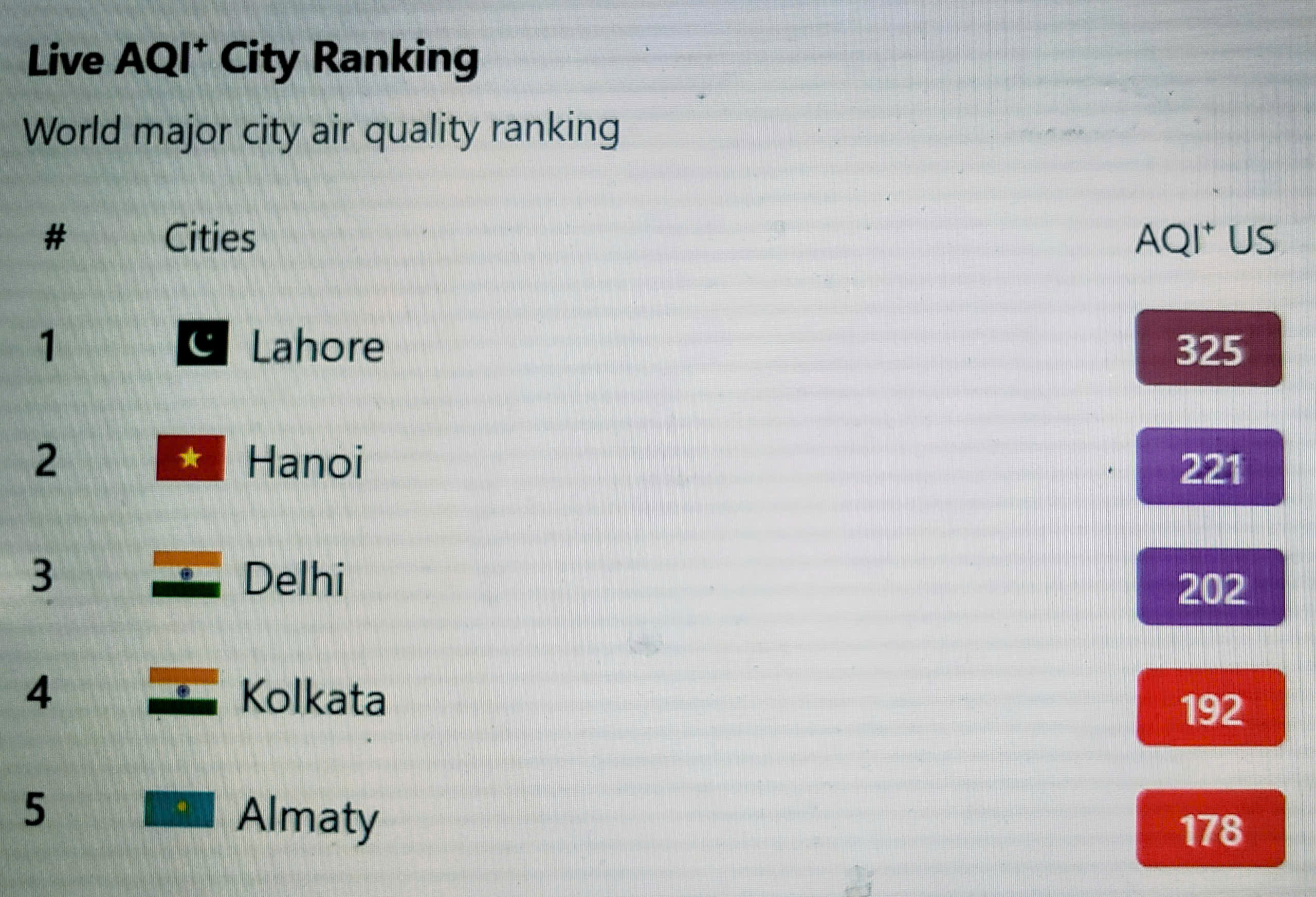 Đáng lo ngại là nồng độ bụi mịn PM2.5 tại Hà Nội lên tới gần 136 µg/m3 , cao gấp gần 10 lần khuyến nghị của Tổ chức Y tế Thế giới (không quá 15 µg/m3). Với chỉ số AQI trên, vào 17 giờ cùng ngày, Hà Nội nằm trong 3 thành phố ô nhiễm nhất thế giới gồm: Delhi (Ấn Độ), Hà Nội và Lahore (Pakistan).