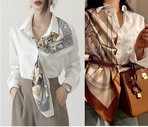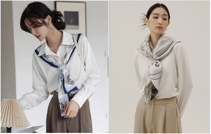 Khăn lụa bản nhỏ quấn sát cổ mang đến cảm giác thanh lịch, gọn gàng và có chút cổ điển. Cách phối này phù hợp với môi trường công sở cần sự chỉn chu cao, đồng thời vẫn tạo nét khác biệt so với cách mặc sơ mi thông thường.