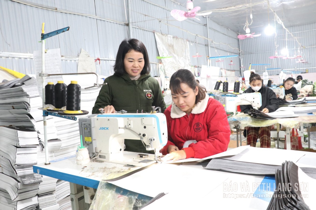 Chị Hoàng Thị Tiền (bên trái) hướng dẫn người lao động thực hiện công đoạn may túi