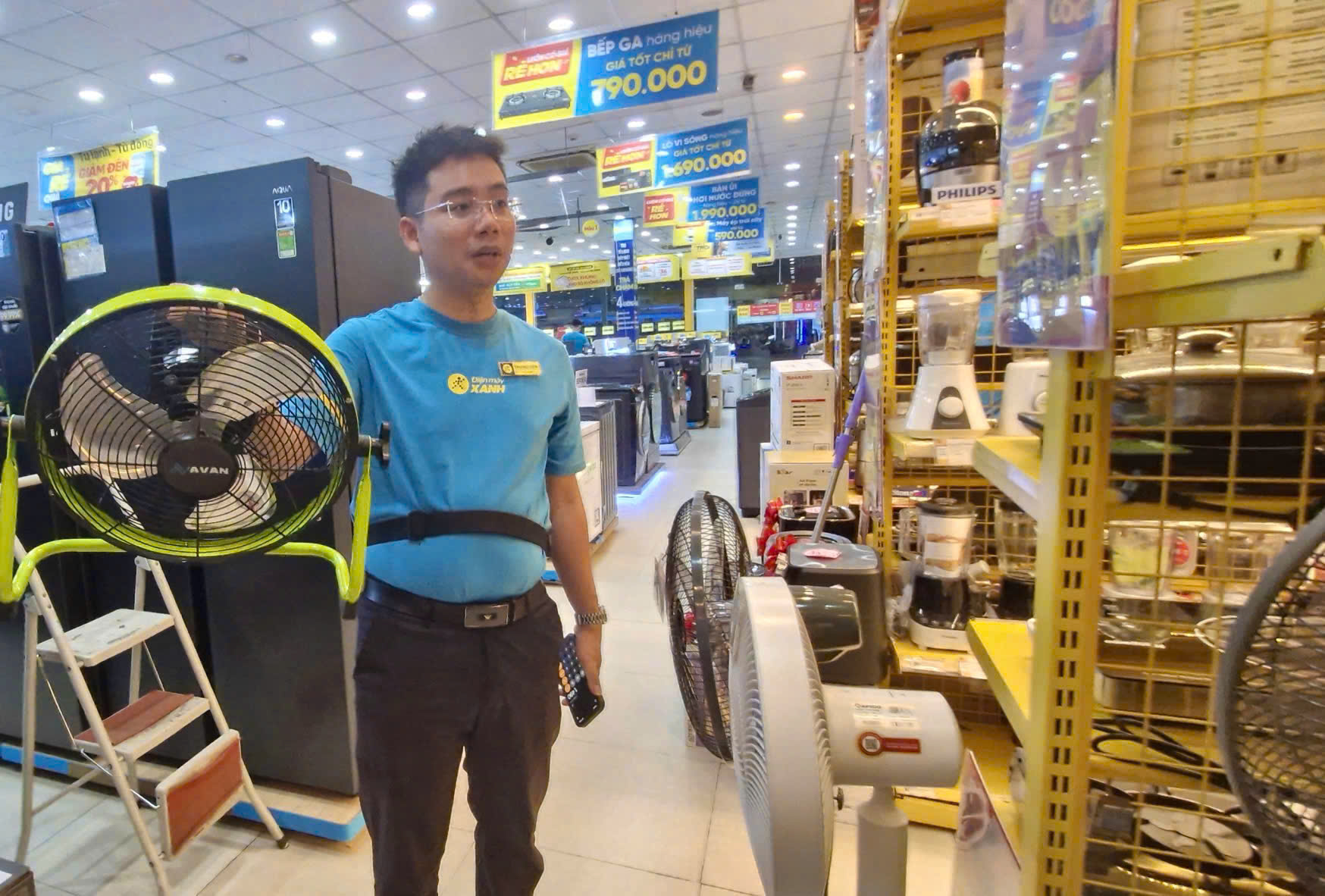 Nhân viên siêu thị điện máy tư vấn quạt tích điện cho khách hàng.