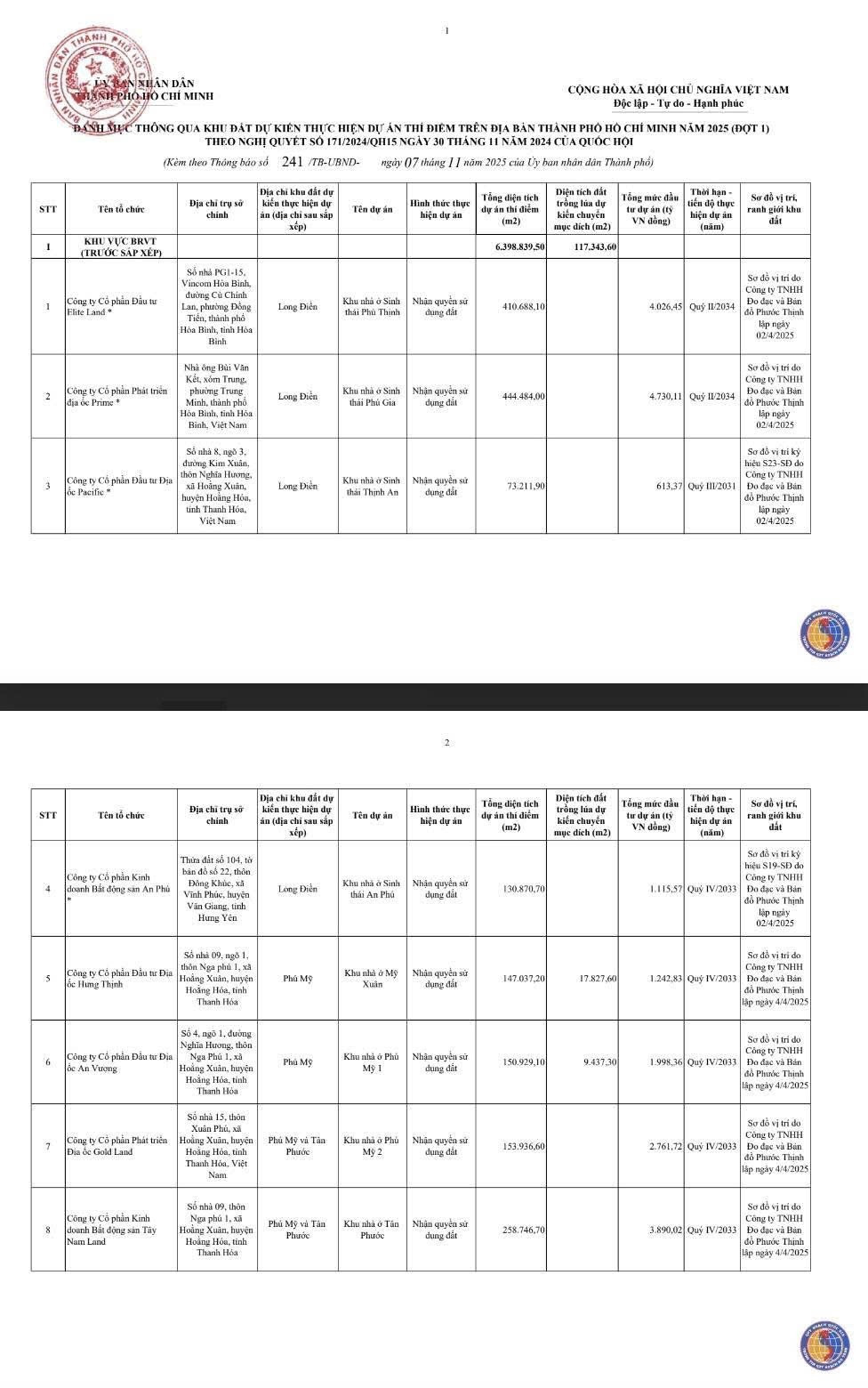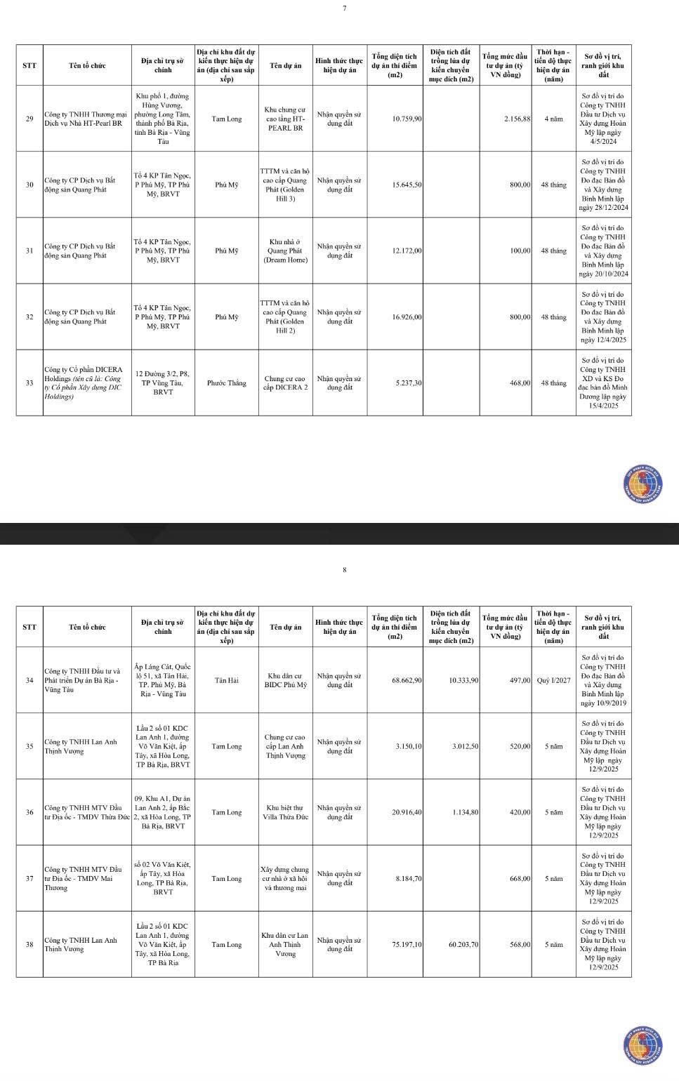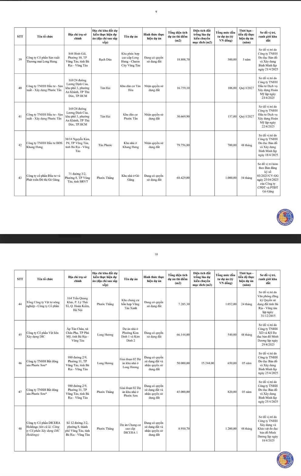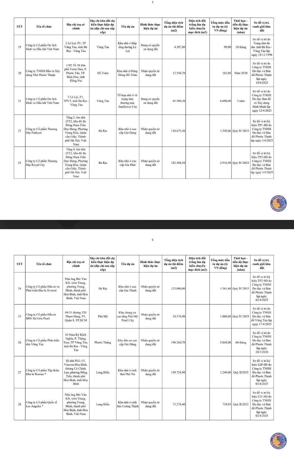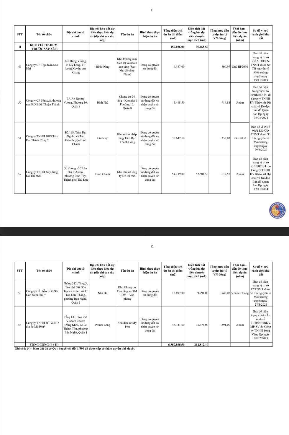 Chi tiết vị trí, diện tích và tên dự án của 54 khu đất: