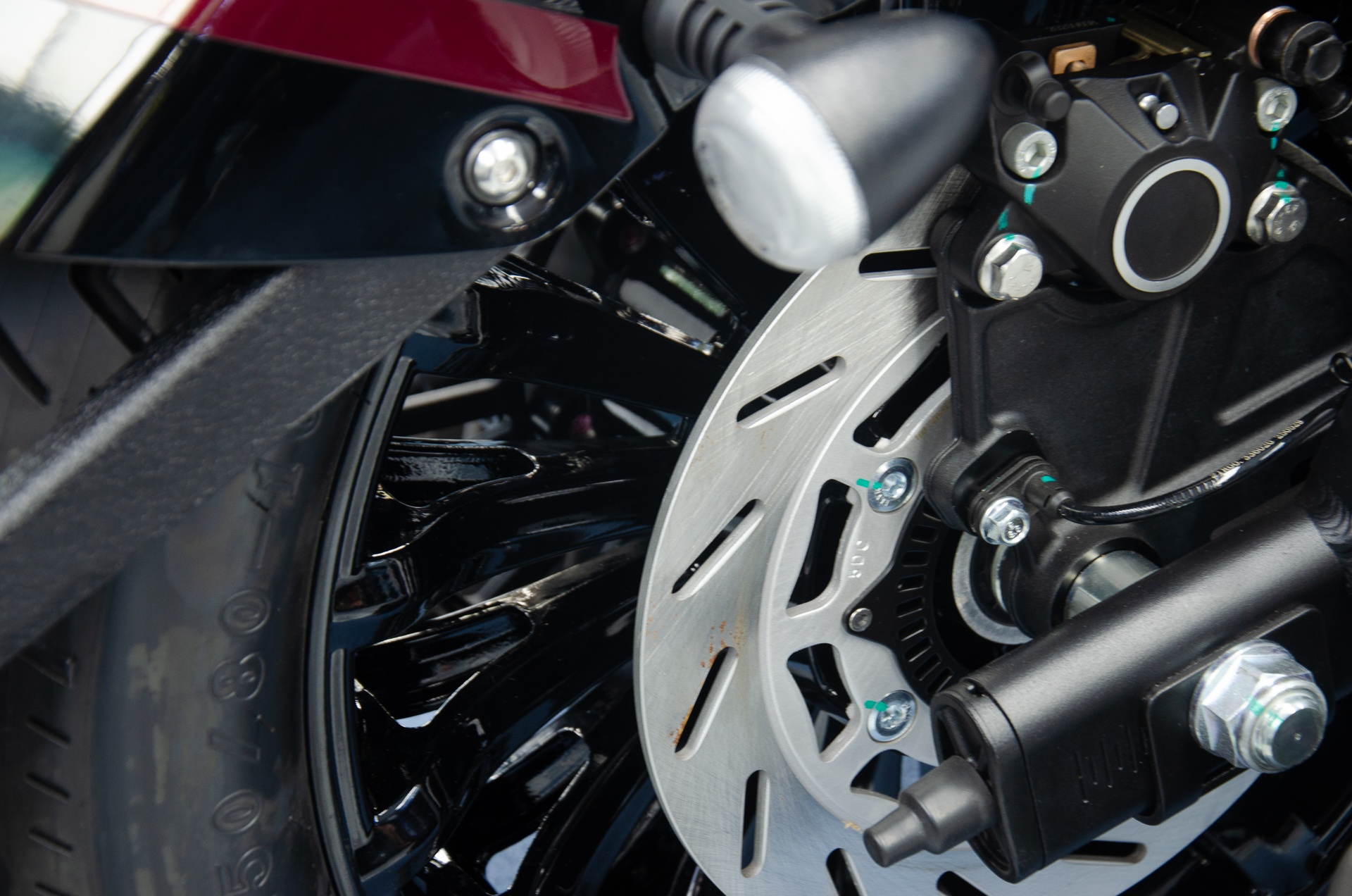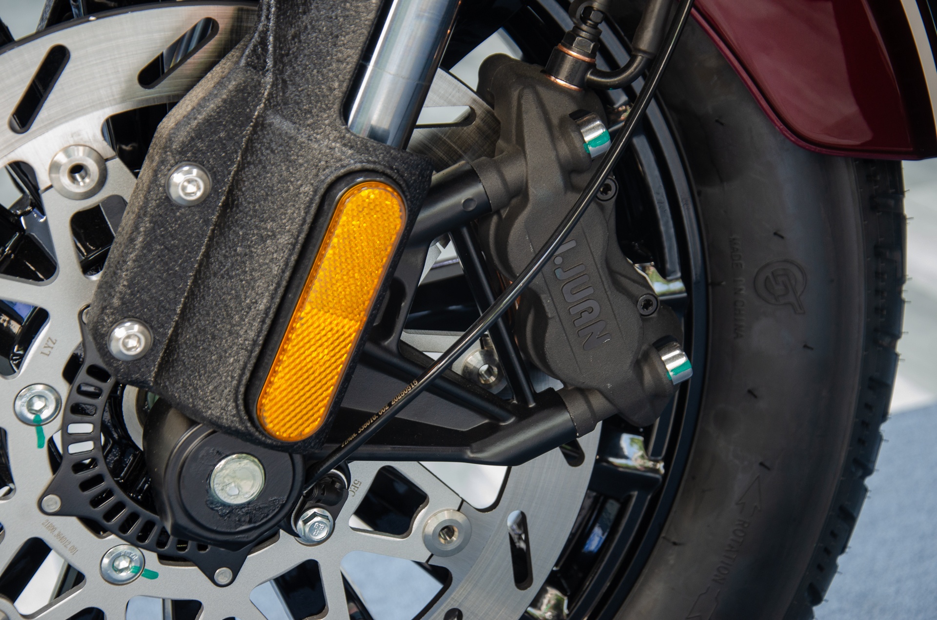 Bánh trước dùng phanh đĩa Brembo đường kính 320 mm, kẹp phanh J.Juan. Tương tự phía sau, tính năng ABS cũng được tích hợp cho hệ thống phanh bánh trước.