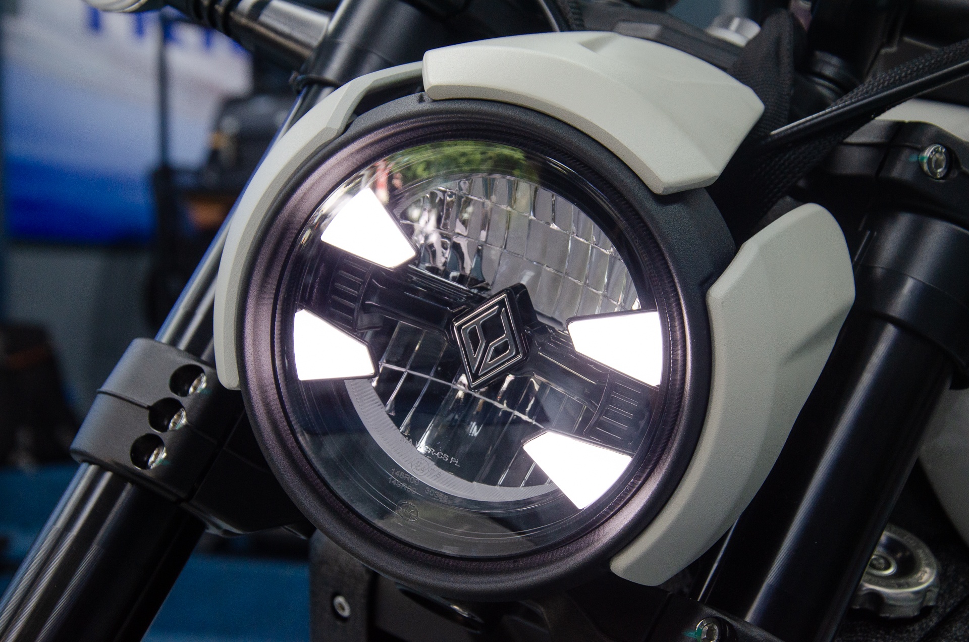 Cụm đèn pha LED sở hữu thiết kế dạng mắt mèo, logo thương hiệu Benda khắc bên trong. Xi-nhan đặt rời.