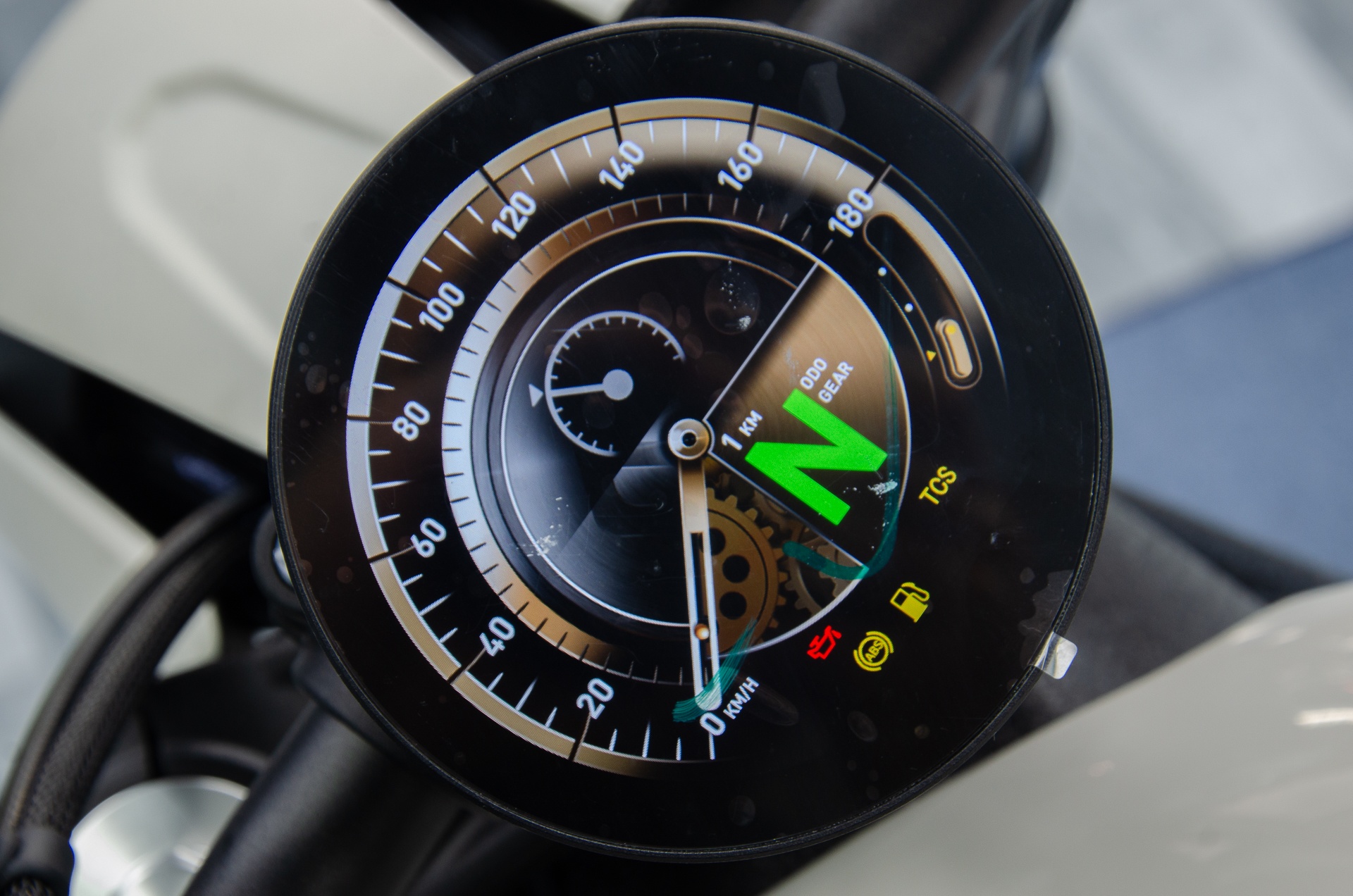 Cụm màn hình TFT dạng tròn, hiển thị sắc nét các thông tin quan trọng như tốc độ, vòng tua hay cấp hiện tại của hệ thống treo khí nén.
