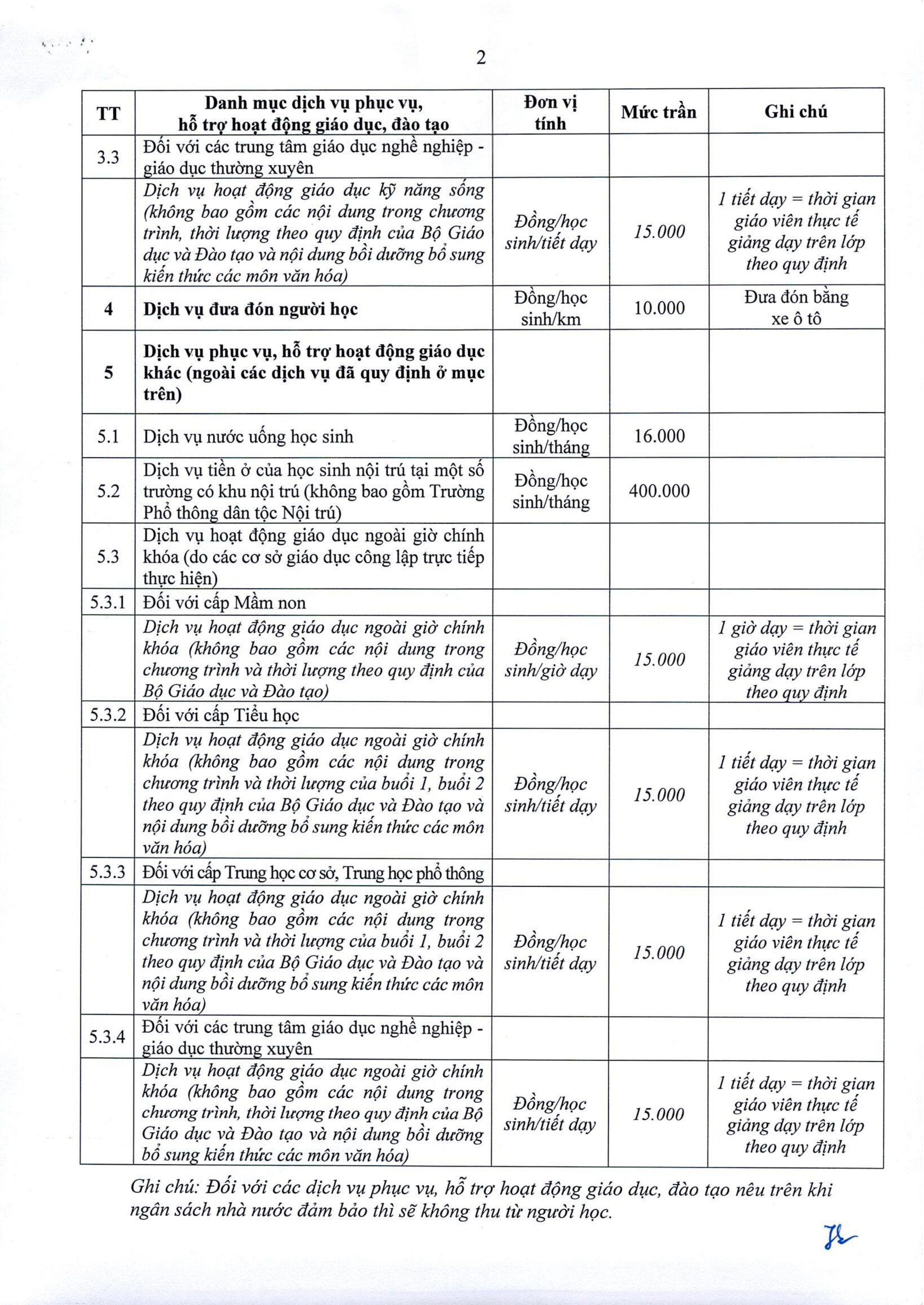 1. Danh mục các khoản thu và mức thu các dịch vụ phục vụ, hỗ trợ hoạt động giáo dục, đào tạo (quy định chi tiết tại phụ lục kèm theo).