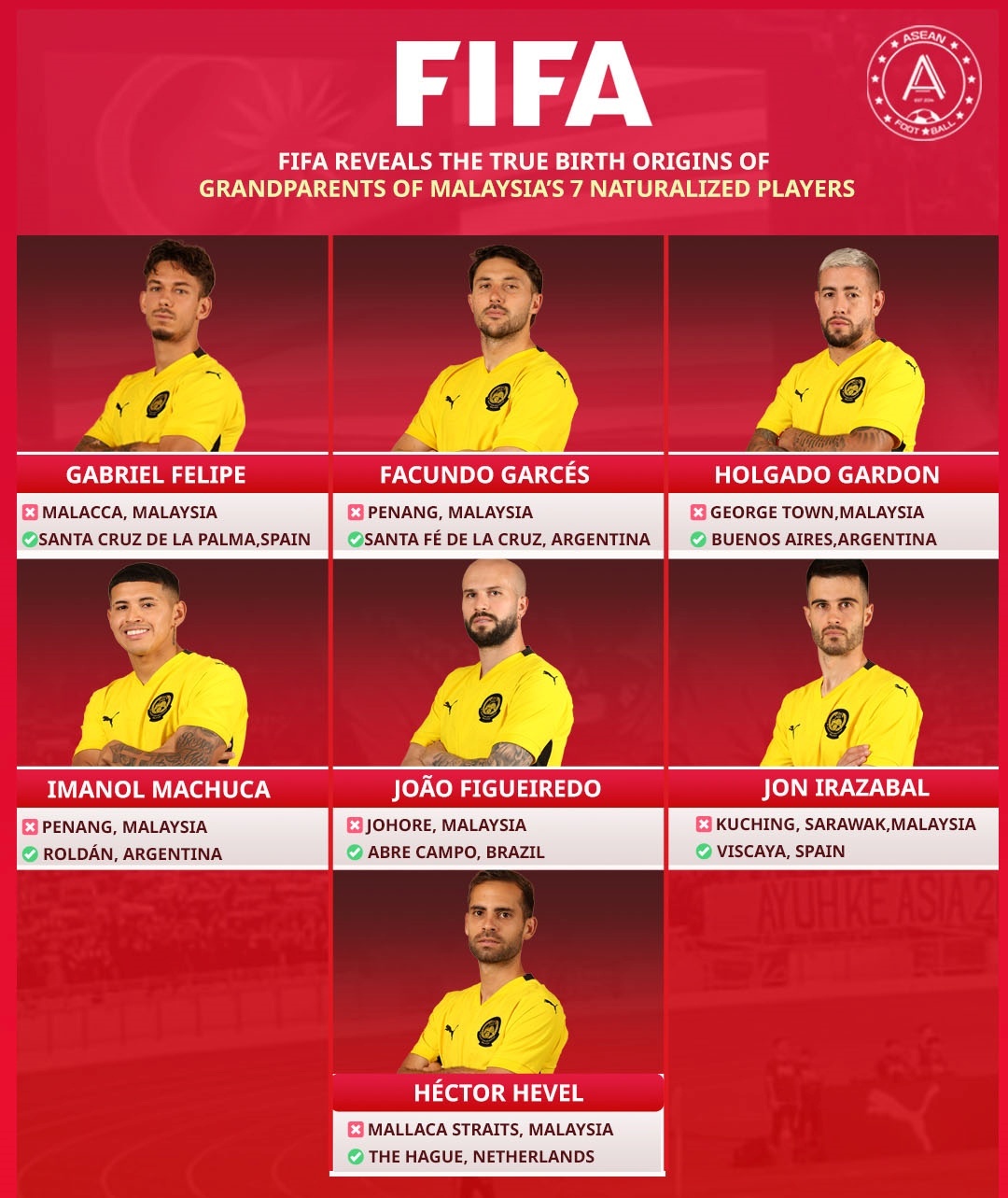 Đáng chú ý nhất là trường hợp của tiền vệ Hector Hevel. FAM báo cáo anh có ông nội sinh tại Melaka, nhưng tài liệu gốc FIFA thu thập chỉ ra nơi sinh thực tế là The Hague (Hà Lan). Tương tự, hồ sơ của Jon Irazabal ghi ông nội người Kuching (Sarawak), trong khi giấy khai sinh gốc cho thấy ở Villa de Guernica (Tây Ban Nha).
