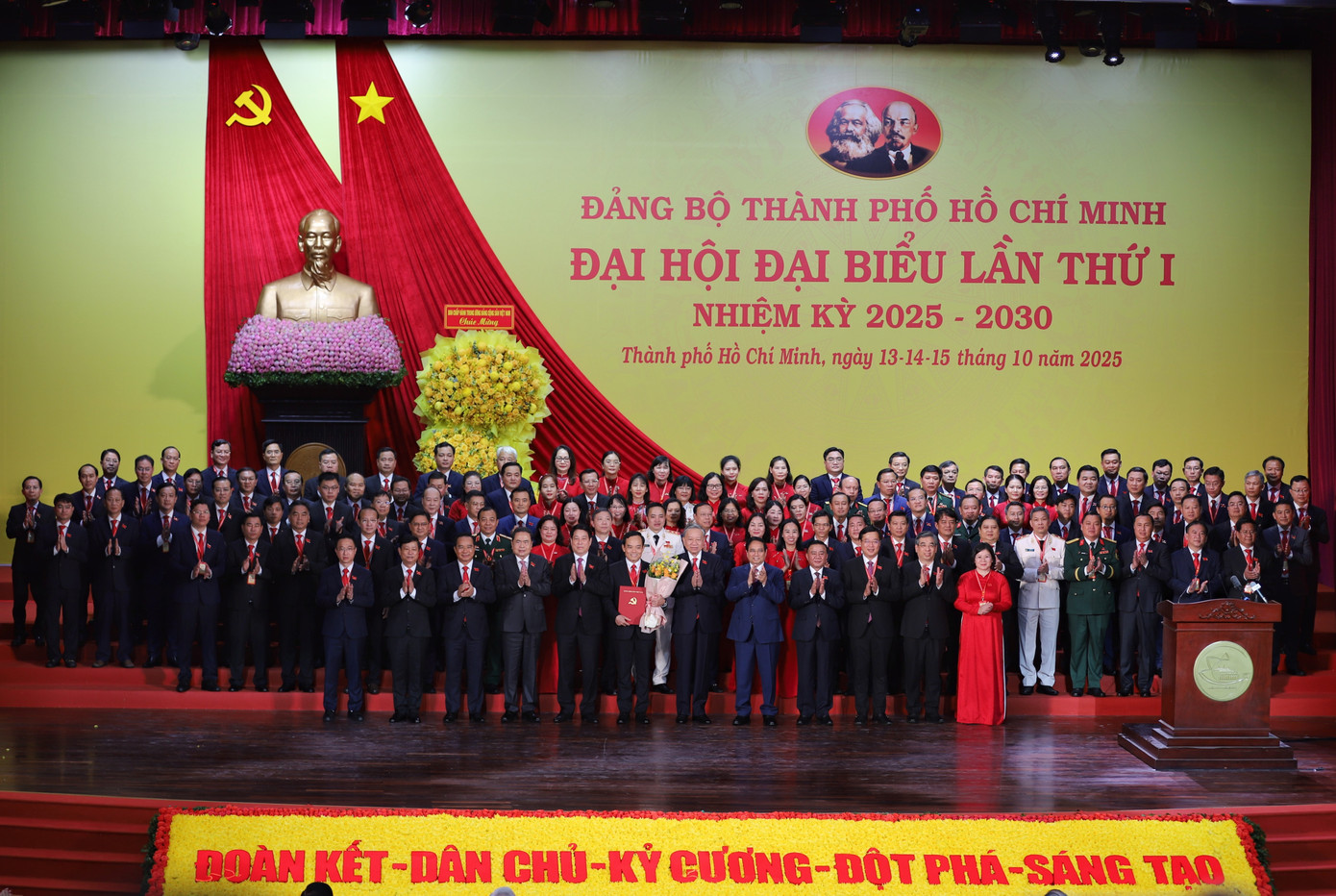 Tổng Bí thư Tô Lâm cùng các lãnh đạo Đảng, Nhà nước chúc mừng và chụp ảnh lưu niệm cùng Ban Chấp hành Đảng bộ TPHCM nhiệm kỳ 2025-2030.