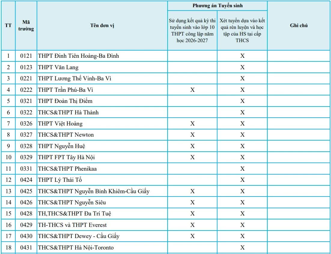 Cụ thể phương án tuyển sinh vào lớp 10 năm học 2026-2027 của các trường THPT chất lượng cao và THPT tư thục trên địa bàn Hà Nội như sau:
