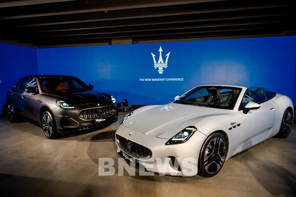 Bộ đôi thuần điện Grecale Folgore và GranCabrio Folgore (siêu xe mui trần màu trắng) gia nhập thị trường ô tô Việt Nam. Ảnh: Văn Xuyên/BNEWS/TTXVN