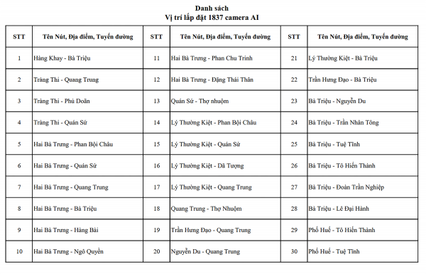 Nhằm nâng cao ý thức chấp hành pháp luật của người dân, với tinh thần công khai, minh bạch, Công an TP Hà Nội thông báo vị trí lắp đặt 1.837 camera AI phục vụ xử lý vi phạm trong lĩnh vực trật tự, an toàn giao thông, trật tự đô thị, trật tự công cộng. Đây là những khu vực có nguy cơ cao phát sinh vi phạm. Việc triển khai camera AI nhằm ghi nhận vi phạm giao thông, làm căn cứ phạt nguội.