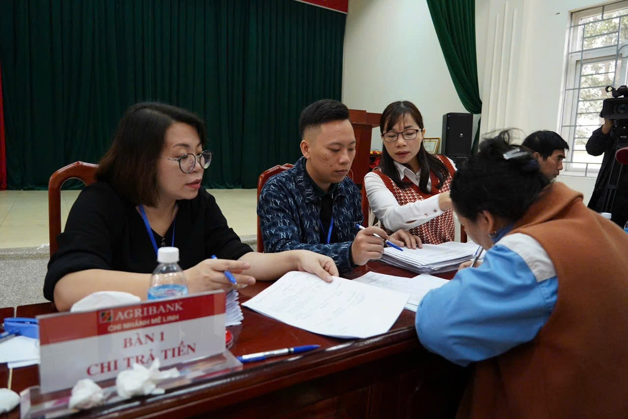 Người dân thôn Yên Vinh và thôn Nội Đồng nhận tiền bồi thường hỗ trợ giải phóng mặt bằng dự án Khu đô thị cao cấp Mê Linh. Ảnh: Hoàng Sơn