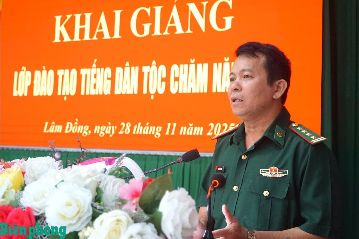 Đại tá Trần Việt Hưng, Bí thư Đảng ủy, Chính ủy Bộ đội Biên phòng tỉnh Lâm Đồng phát biểu chỉ đạo tại buổi khai giảng lớp đào tạo tiếng Chăm. Ảnh: Duy Thắng