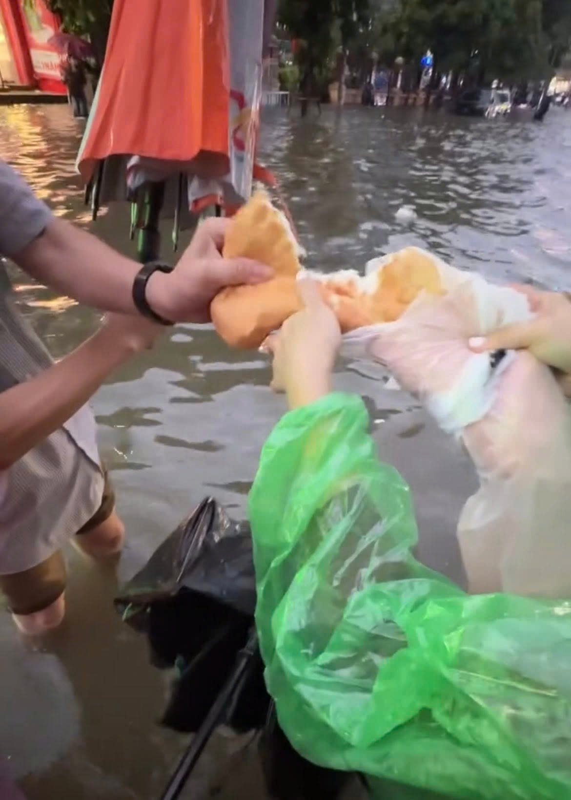 "Trời về khuya, nhiều người liên hệ tôi hỏi bánh nước nhưng kẹt quá không lên được nhà. Tôi đành trực tiếp xuống đường phân phát đồ ăn cho ai cần", Trang nói.