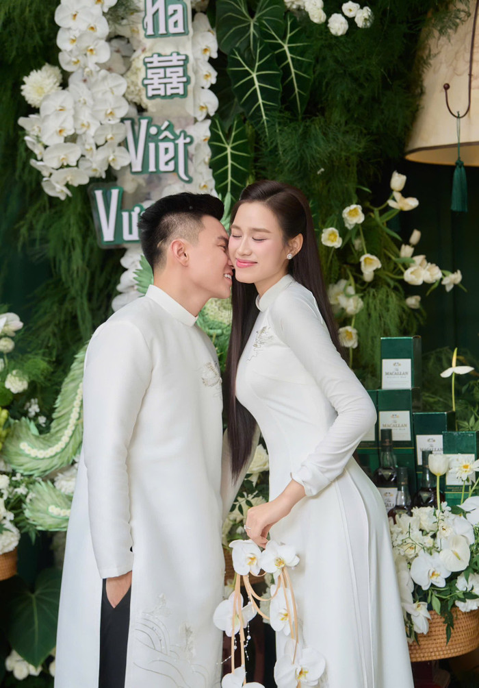 Trong ảnh, nàng hậu lựa chọn áo dài trắng đơn giản nhưng thanh lịch, mái tóc dài buông nhẹ, trang điểm nhẹ nhàng, tạo tổng thể nền nã và trang trọng. Nụ cười rạng rỡ cùng ánh mắt hạnh phúc của cô nhanh chóng thu hút sự chú ý của công chúng.