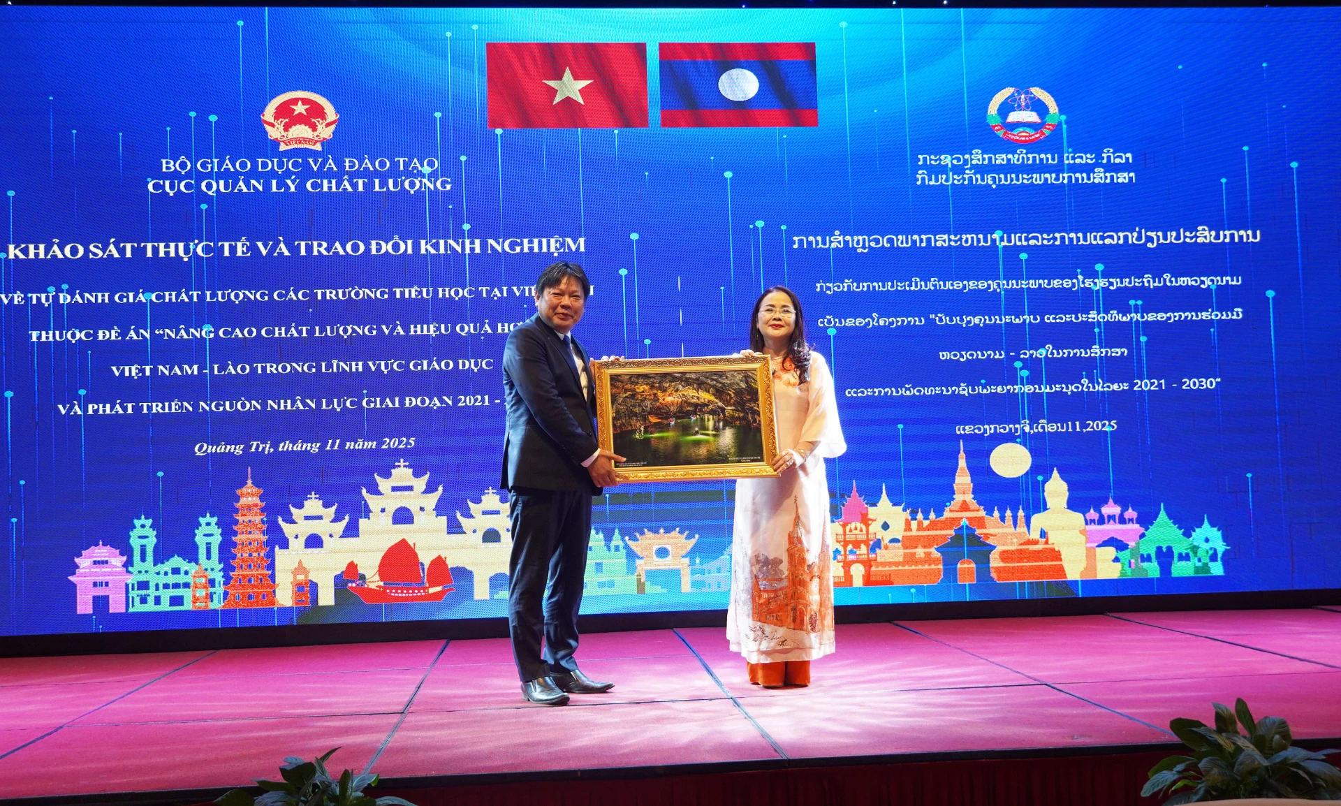 Đại diện Sở GD-ĐT Quảng Trị tặng quà lưu niệm cho Bộ Giáo dục-Thể thao Lào - Ảnh: M.H