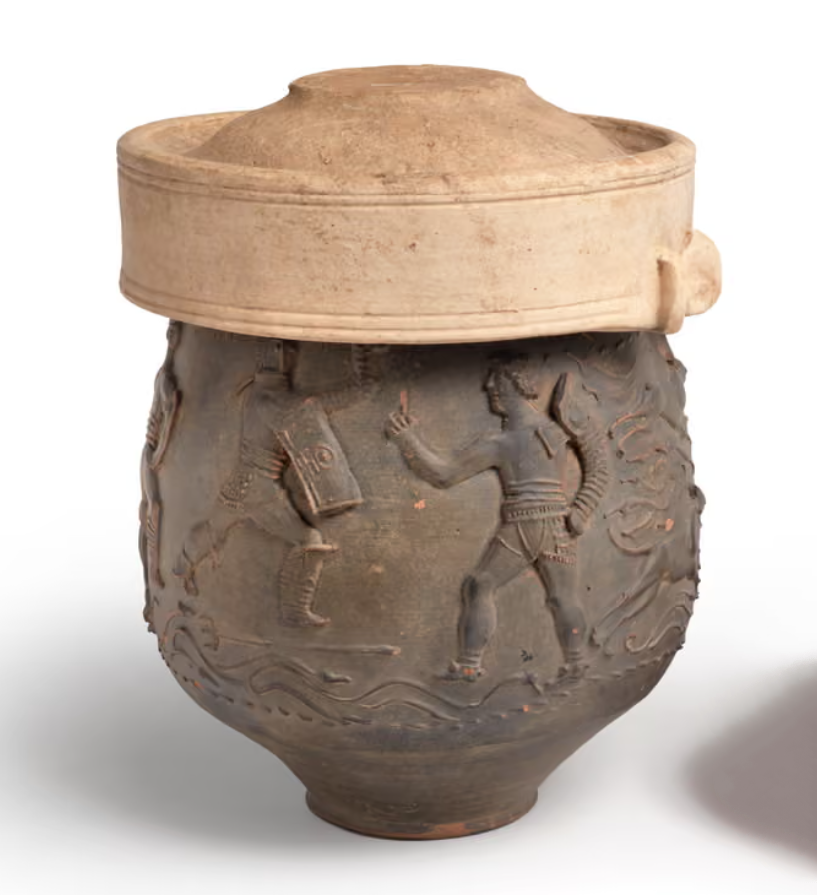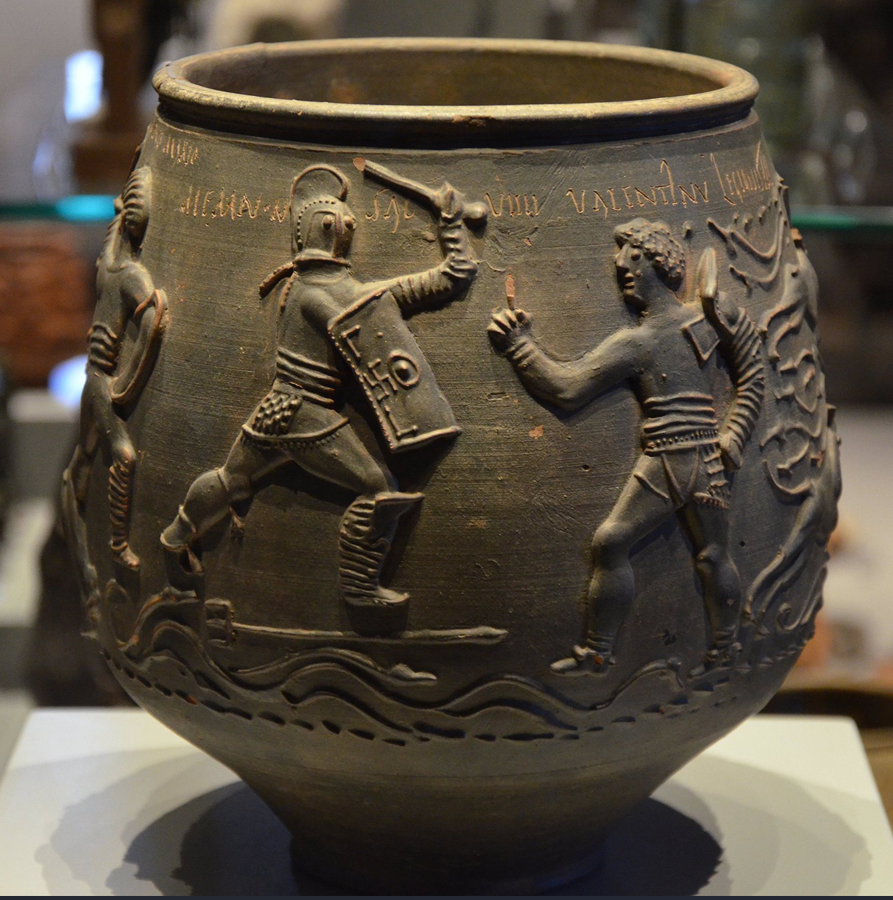 Điều đáng nói là mặt ngoài chiếc bình cổ Colchester này đúc nổi một cảnh tượng trận đấu của đấu sĩ đấu kiếm ở Anh thời La Mã cổ đại. Ảnh: @Bảo tàng Colchester.