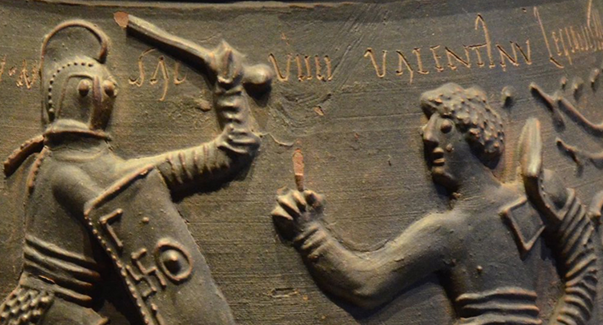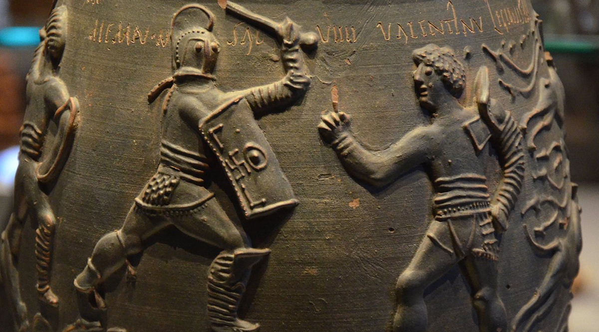 Trên bình còn có dòng chữ khắc tên hai đấu sĩ, Memnon và Valentinus, gây ngạc nhiên các chuyên gia bảo tàng. Ảnh: @Bảo tàng Colchester.